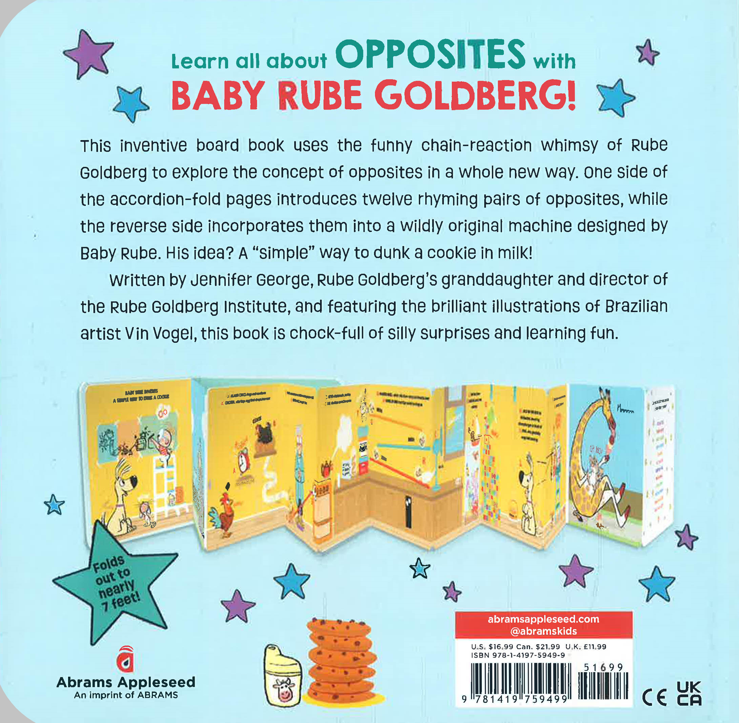 Turn the book over to discover Baby Rube Goldberg’s hilarious and out-of-the-box invention that includes all 12 sets of opposites and demonstrates a “simple” way to dunk a cookie in milk! Written by Jennifer George, Rube Goldberg’s granddaughter and the legacy director of Rube Goldberg, Inc., and featuring the brilliant illustrations of Vin Vogel, Baby Rube’s Opposites is chockful of silly surprises for the youngest aspiring inventors.