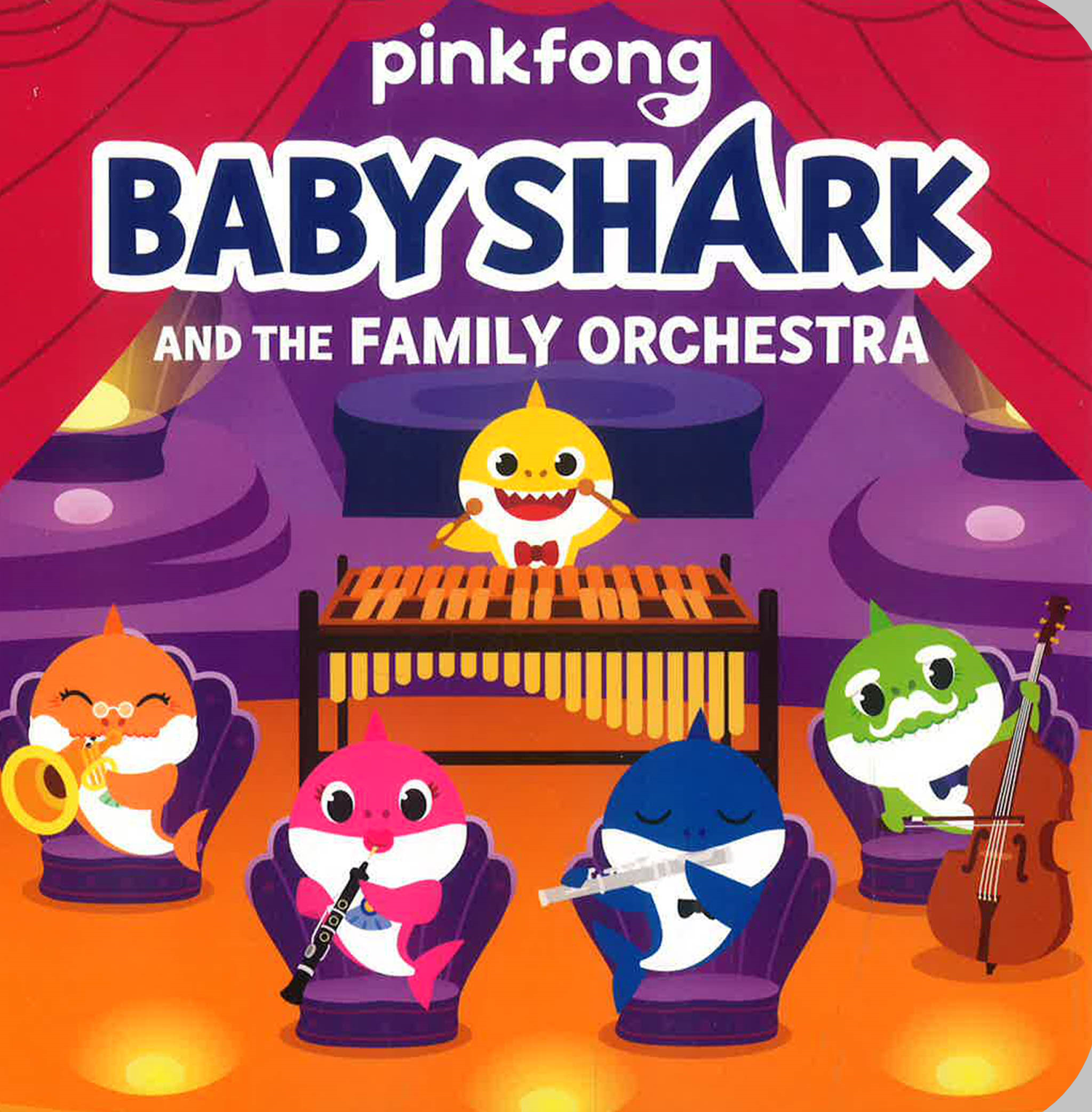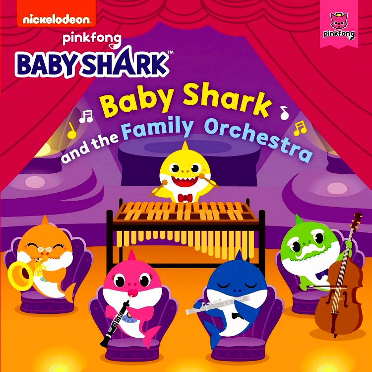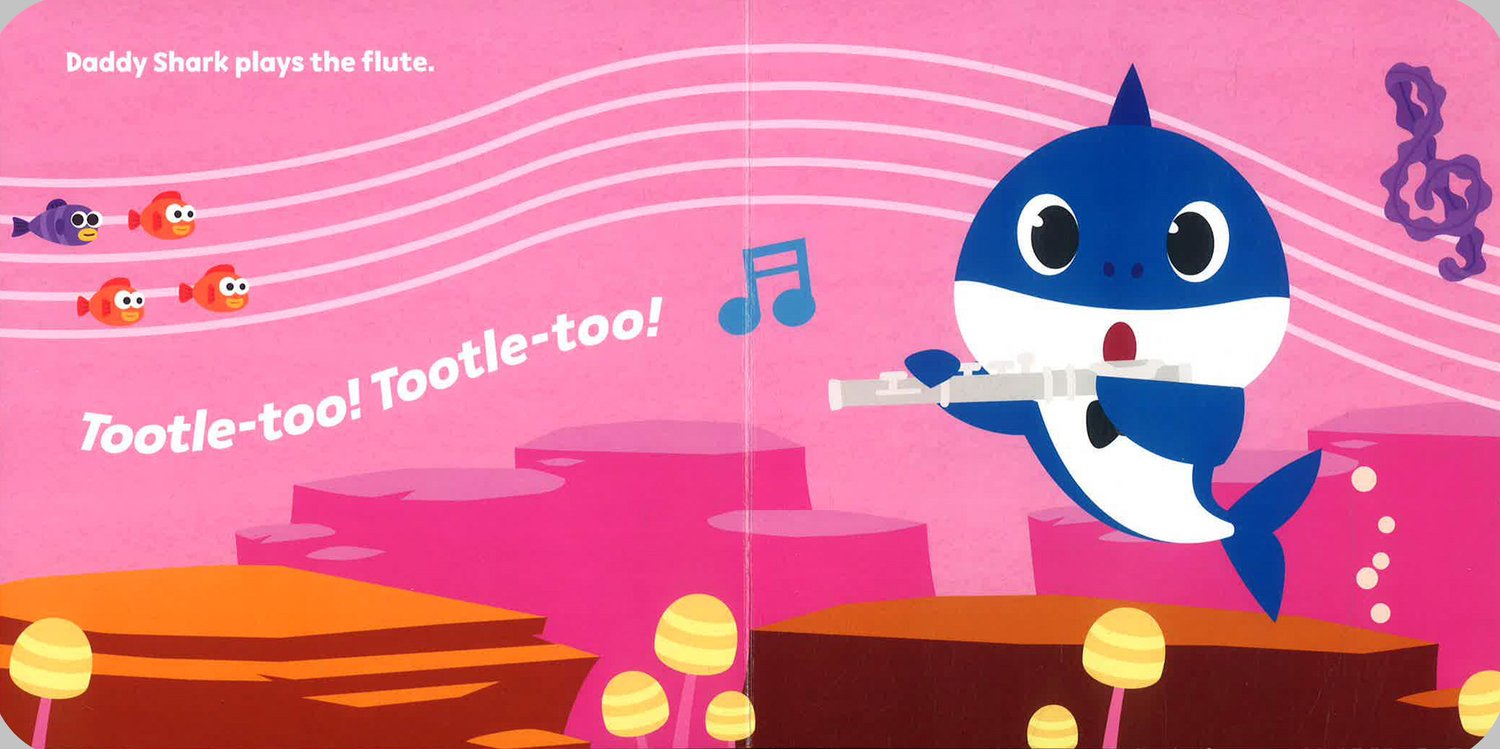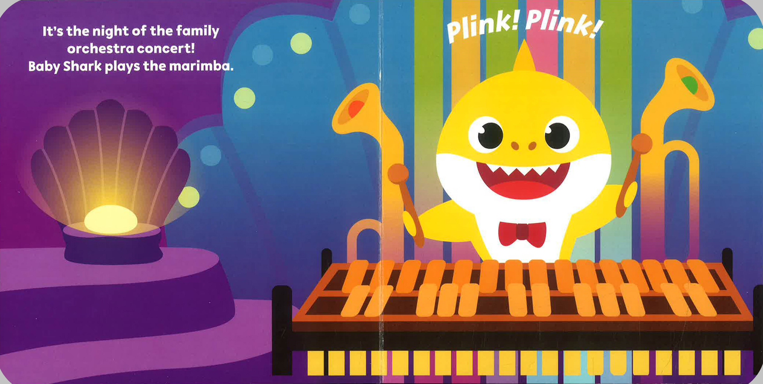 It’s time to sing and dance with Baby Shark!In Baby Shark and the Family Orchestra,Baby Shark and his parents and grandparents come together to create magnificent underwater music!