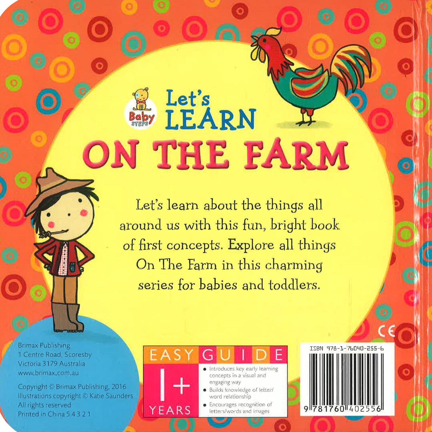 Let's learn about the things all around us with this fun, bright first-concept book. Explore Things On The Farm in this charming series for babies and toddlers. Cased board book featuring tactile 3D cover with embossing that will delight small hands. Gorgeous, personable illustrations by best-selling author Katie Saunders will engage and captivate young children. Naming and pointing at the simple words and pictures will help every young child's language to grow as they experience the world around them.