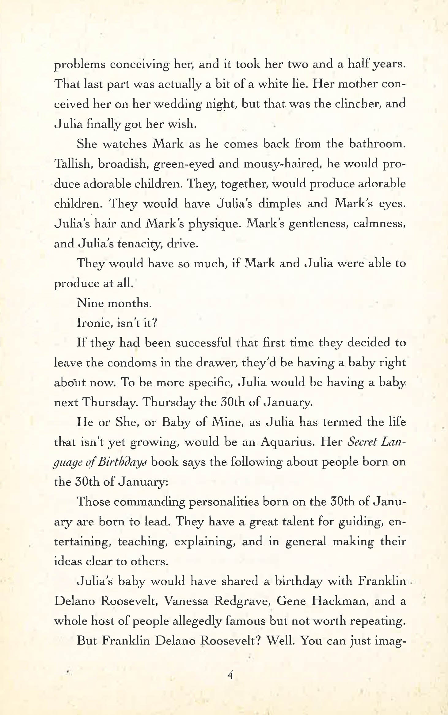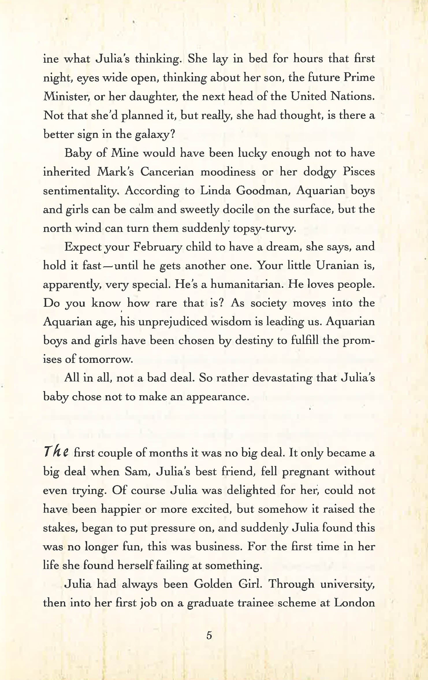 Meet Julia, a wildly successful television producer who appears to have the picture-perfect life. But beneath the surface, things are not as perfect as they seem. Stuck in a loveless relationship with her boyfriend, Mark, Julia thinks a baby is the answer . . . but she may want a baby more than she wants her boyfriend. Maeve, on the other hand, is allergic to commitment. A feisty, red-haired, high-power career girl, she breaks out in a rash every time she passes a stroller. But when her no-strings-attached nightlife leads to an unexpected pregnancy, her reaction may be just as unexpected . . . And then there's Samantha-happily married and eager to be the perfect June-Cleaver mother. But baby George brings only exhaustion, extra pounds, and marital strife to her once tidy life. Is having an affair with a friend's incredibly sexy husband the answer? Book has remainder mark & shelf-wear sign