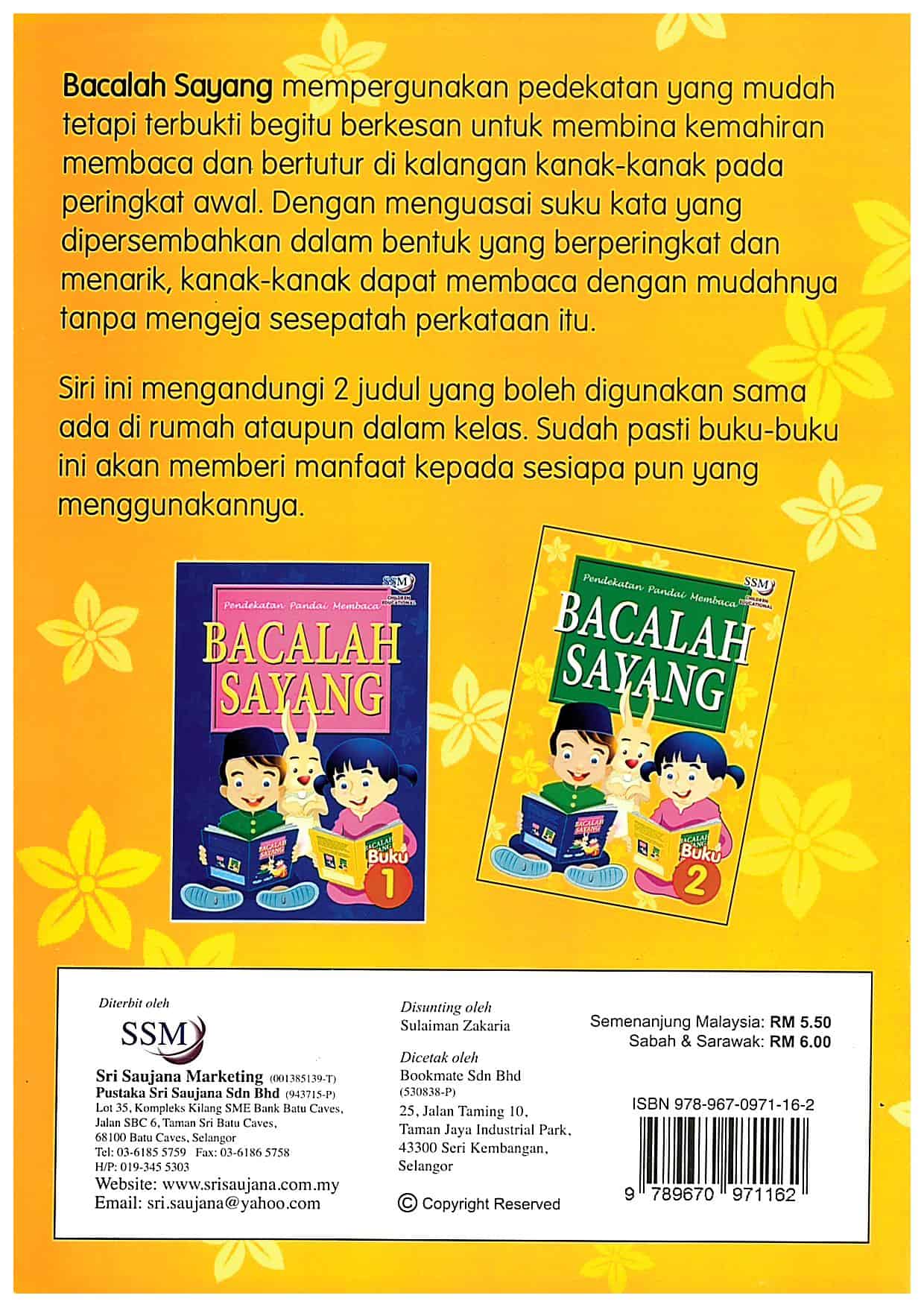Bacalah Sayang mempergunakan pedekatan yang mudah tetapi terbukti begitu berkesan untuk membina kemahiran membaca dan bertutur di kalangan kanak-kanak pada peringkat awal. Dengan menguasai suku kata yang dipersembahkan dalam bentuk yang berperingkat dan menarik, kanak-kanak dapat membaca dengan mudahnya tanpa mengeja sesepatah perkataan itu. Siri ini mengandungi 2 judul yang boleh digunakan sama ada di rumah ataupun dalam kelas. Sudah pasti buku-buku ini akan memberi mantaat kepada sesiapa pun yang menggunakannya. Buku Aktiviti Bacalah Sayang, Buku I dan 2, merupakan buku-buku aktiviti untuk menilai pencapaian anak anda terhadap program pembacaan awal yang mempergunakan kaedah Suku Kata sebagaimana yang dipersembahkan dalam 2 judul buku pembacaan yang berjudul Pendekatan Pandai Membaca, Bacalah Sayang Buku I dan 2, sebelum ini. Latihan-latihan yang dirancang dalam setiap buku ini secara berperingkat dan sistematik. Bahan-bahan yang berbagai bagai jenis dan kata-kata yang terpilih itu bersesuaian 08 dengan perkembangan kognitif anak anda. Semoga terbitan buku-buku ini dapat dipergunakan anak anda untuk mengukuhkan kefahamannya terhadap program pembacaan tersebut, dan setelah menguasai kaedah penyebutan ini, dia akan dapat menyebut dengan tepatnya lagi penuh keyakinan tanpa mengeja sesepatah kata itu.