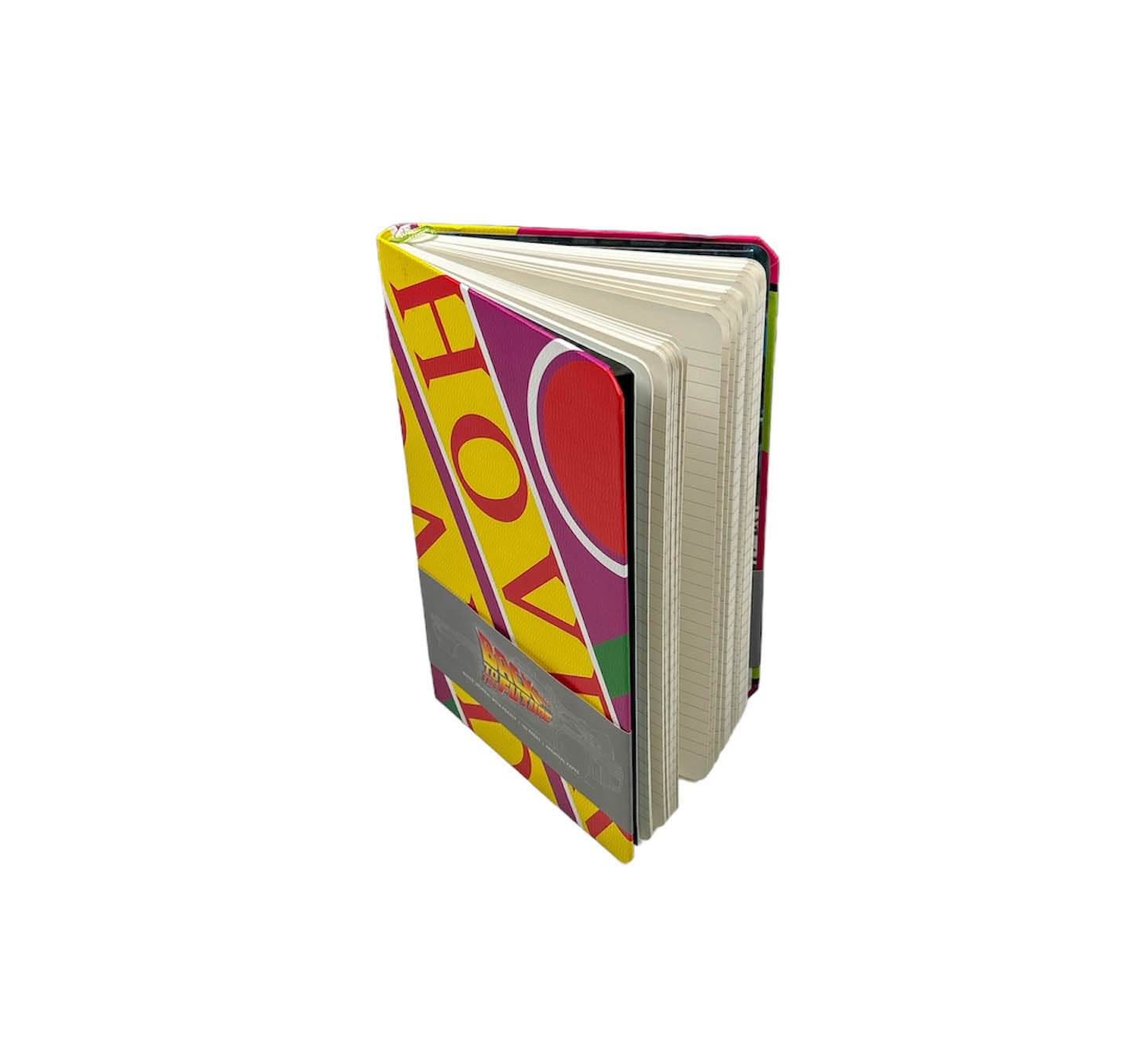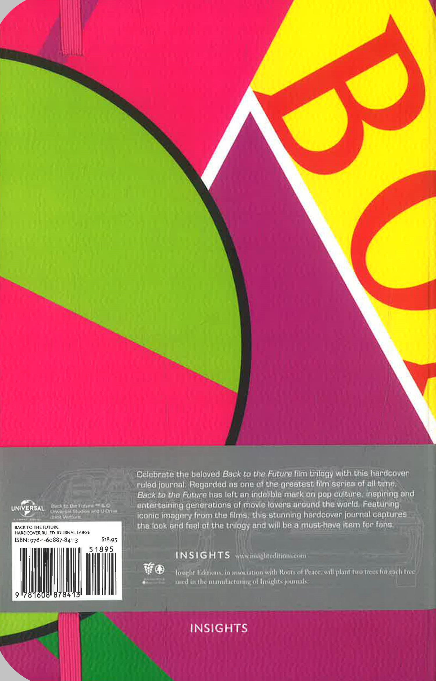 Celebrate the beloved Back to the Future film trilogy with this hardcover ruled journal. Regarded as one of the greatest film series of all time, the three Back to the Future movies have left an indelible mark on pop culture, inspiring and entertaining generations of movie lovers around the world. Featuring iconic imagery from the films, this stunning hardcover journal captures the iconic look and feel of the trilogy and will be a must-have item for fans. With sturdy construction and sewn binding, this journal lies flat, and the 192 lined, acid-free pages of high-quality heavy stock paper take both pen and pencil nicely to invite a flow of inspiration. All this, plus a ribbon placeholder, elastic closure, and 4.5 x 7.5-inch back pocket, perfect for holding photographs and mementos.