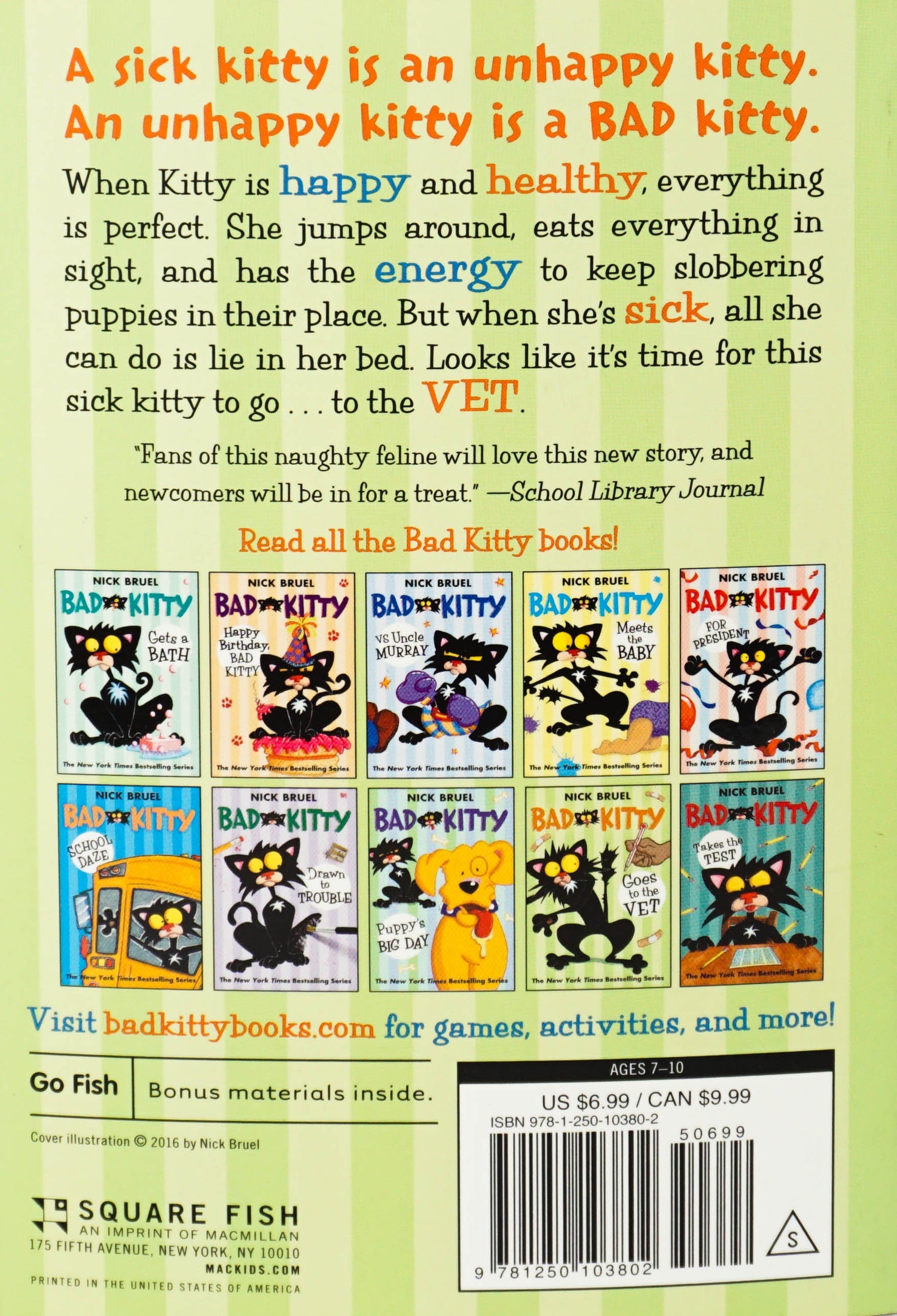 When Kitty is happy and healthy, everything is perfect. She jumps around, eats everything in sight and has the energy to keep slobbering puppies in their place. But when she's sick, all she can do is lie in her bed. Looks like it's time for this sick kitty to go... to the vet. When Kitty's family finally manages to get their clawing, angry pet into the doctor's office, it's a wild adventure for Kitty who has to get the most dreaded thing of all...a shot. Once administered, Kitty is cast into an ingenious dream within a dream sequence in which she has to make right by puppy or risk being shut out of PussyCat heaven forever. Bad Kitty Goes to the Vet, the 9th installment of the popular Bad Kitty series by Nick Bruel is chock full of brilliant supporting characters and of course, the crankiest bad kitty you've ever seen.