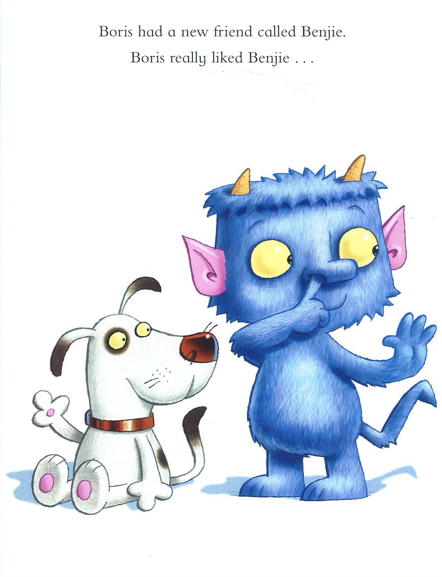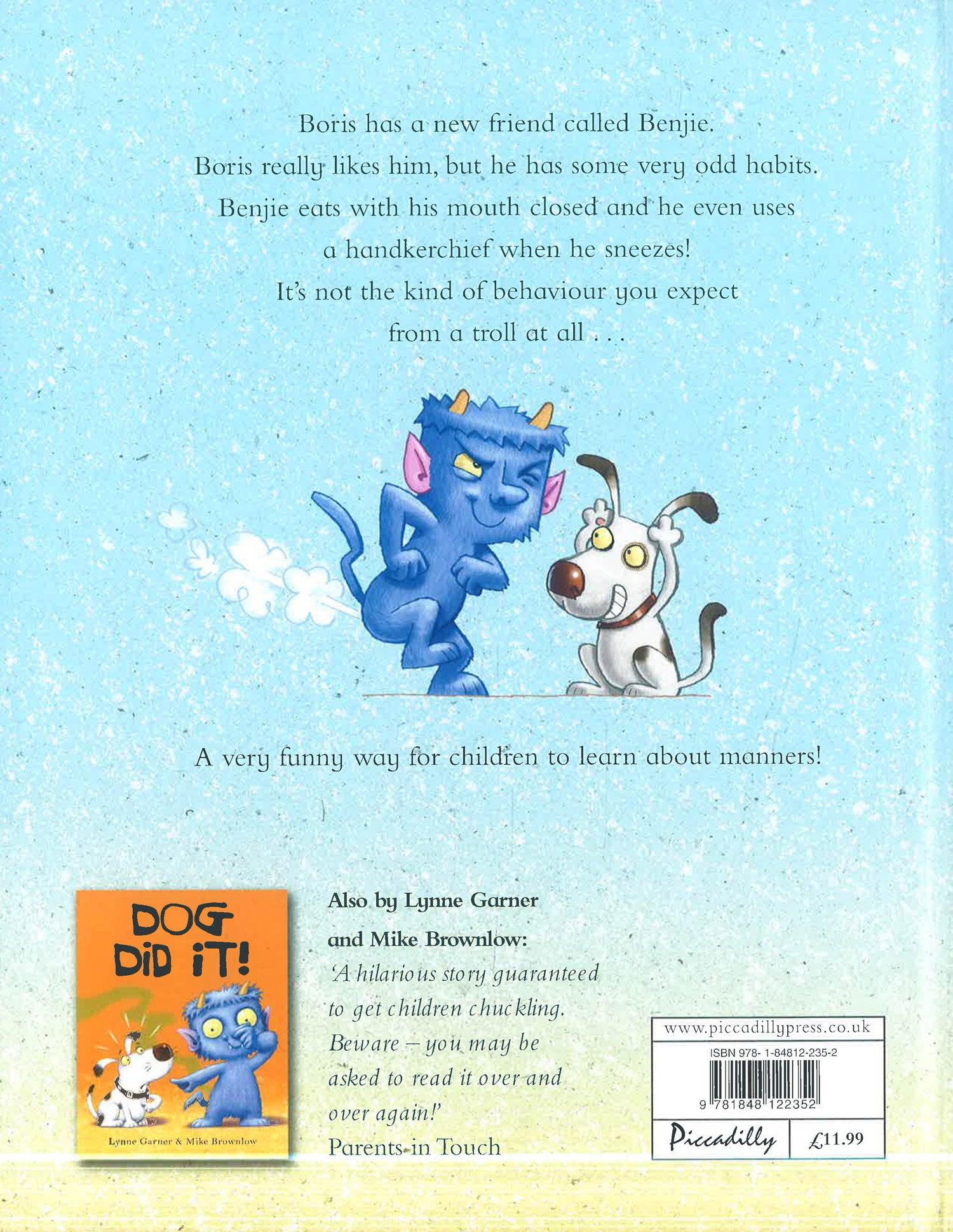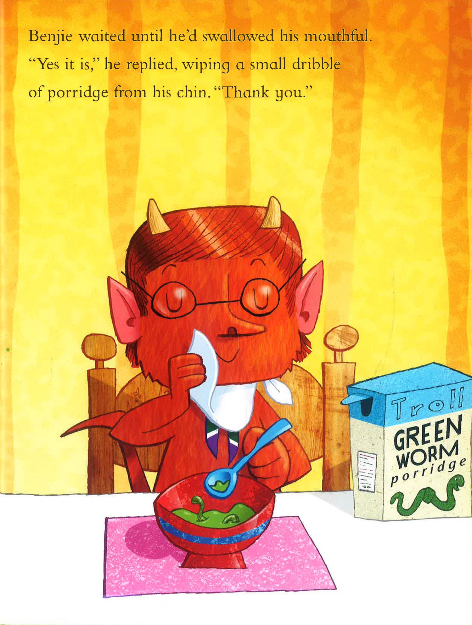Boris had a new friend called Benjie. Boris really liked Benjie, but he didn't like his manners. One morning, Benjie came for breakfast. As they ate their breakfast, Boris slurped and slobbered. "Mmm, this is nice," he said, his mouth bulging with green worm porridge. Benjie waited until he'd swallowed his mouthful. "Yes it is," he replied, wiping a small dribble of porridge from his chin. Thank you." Benjie is not behaving at all like a troll should and Boris has to teach him some manners!