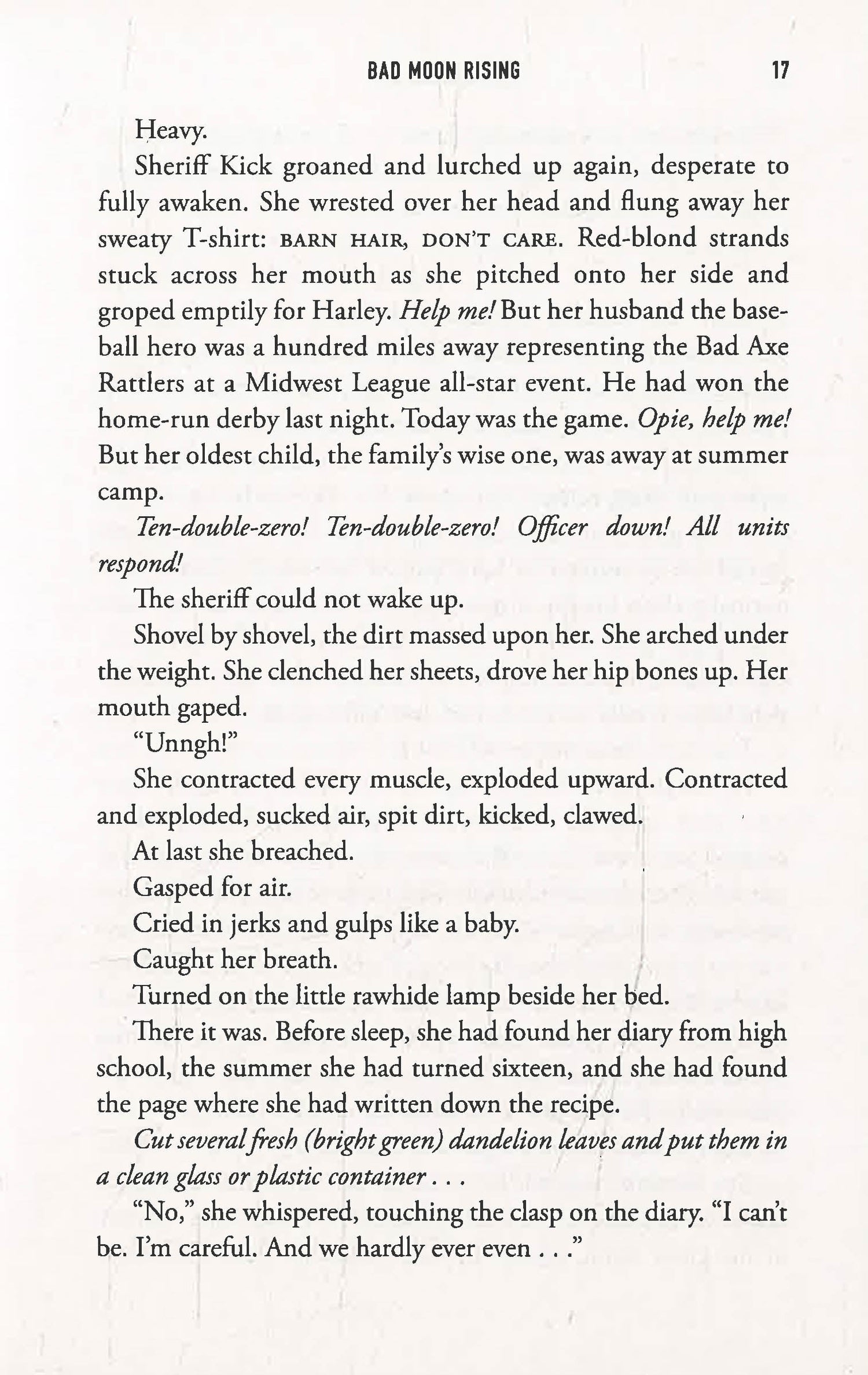 Sheriff Heidi Kick has a dead body on her hands, a homeless young man last seen alive miles from the Bad Axe. Chillingly, the medical examiner confirms what Sheriff Kick has been experiencing in her own reoccurring nightmares of late: the victim was buried alive. As the relentless summer heat bears down and more bodies are discovered, Sheriff Kick also finds herself embroiled in a nasty reelection campaign. These days her detractors call her “Sheriff Mommy” KICK HER OUT holler the opposition’s campaign signs and as her family troubles become public, vicious rumors threaten to sway the electorate and derail her investigation.