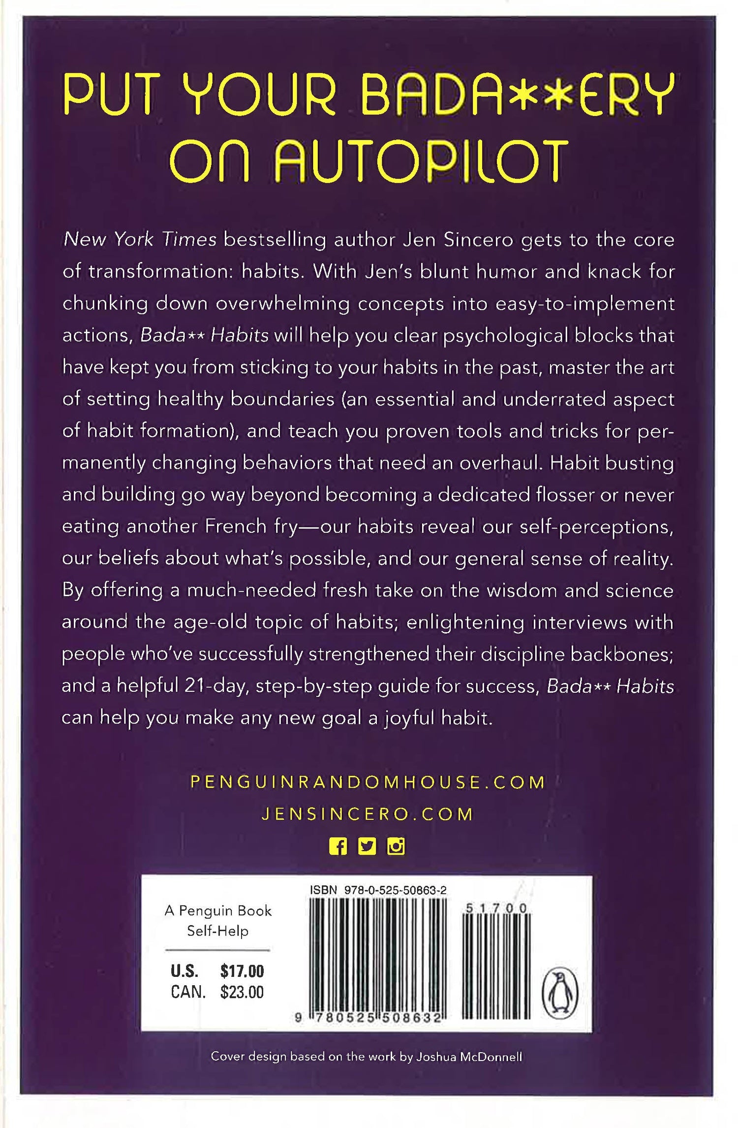 New York Times bestselling author Jen Sincero gets to the core of transformation: habits. With Jen' blunt humor and knack for chunking down overwhelming concepts into easy-to-implement actions, Bada** Habits will help you clear psychological blocks that have kept you from sticking to your habits in the past, master the art of setting healthy boundaries (an essential and underrated aspect of habit formation), and teach you proven tools and tricks for permanently changing behaviors that need an overhaul.