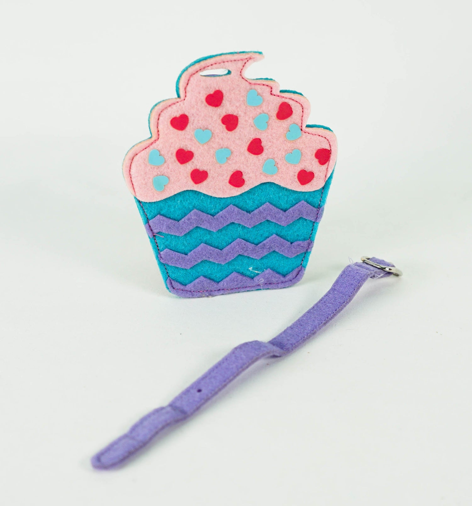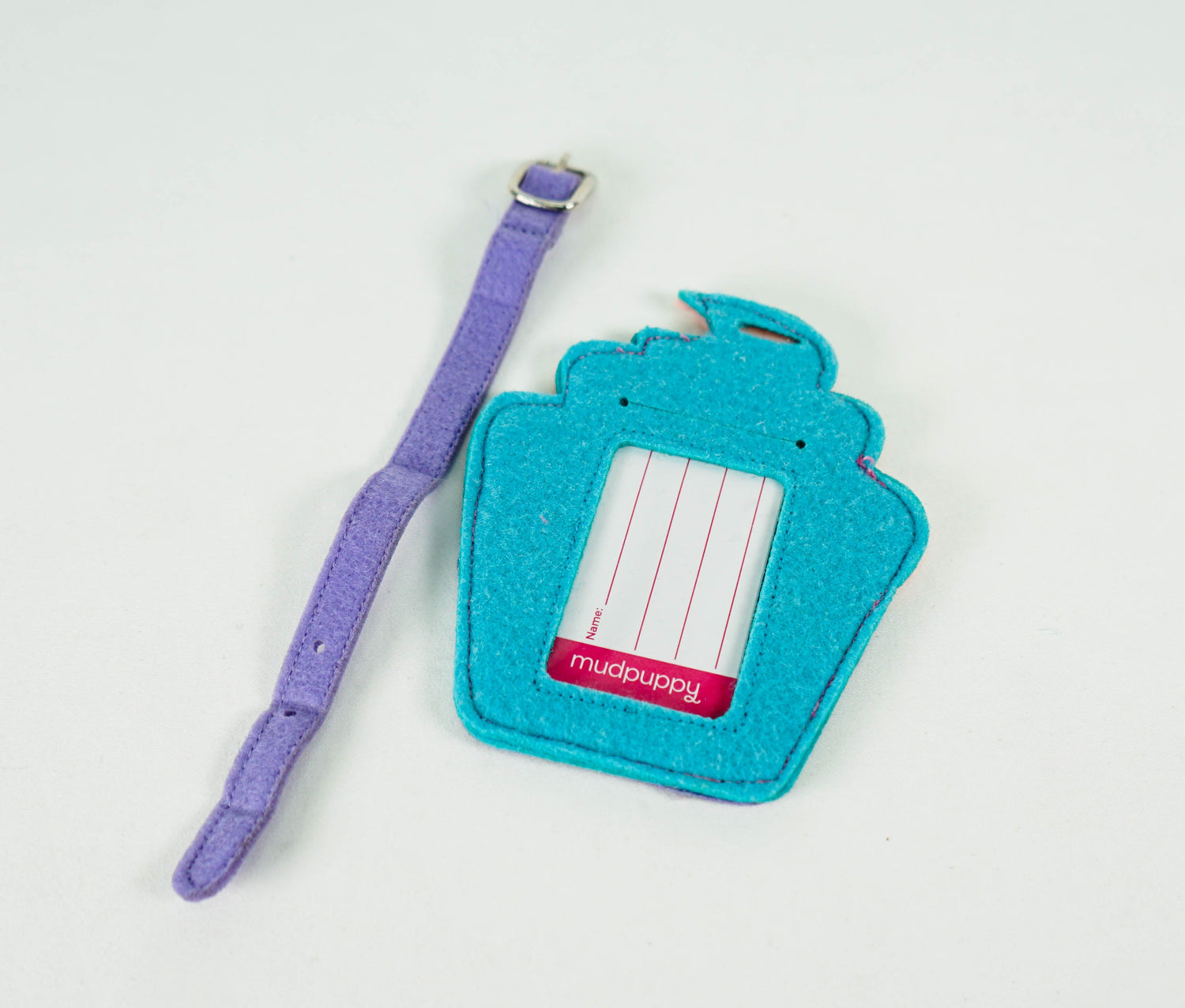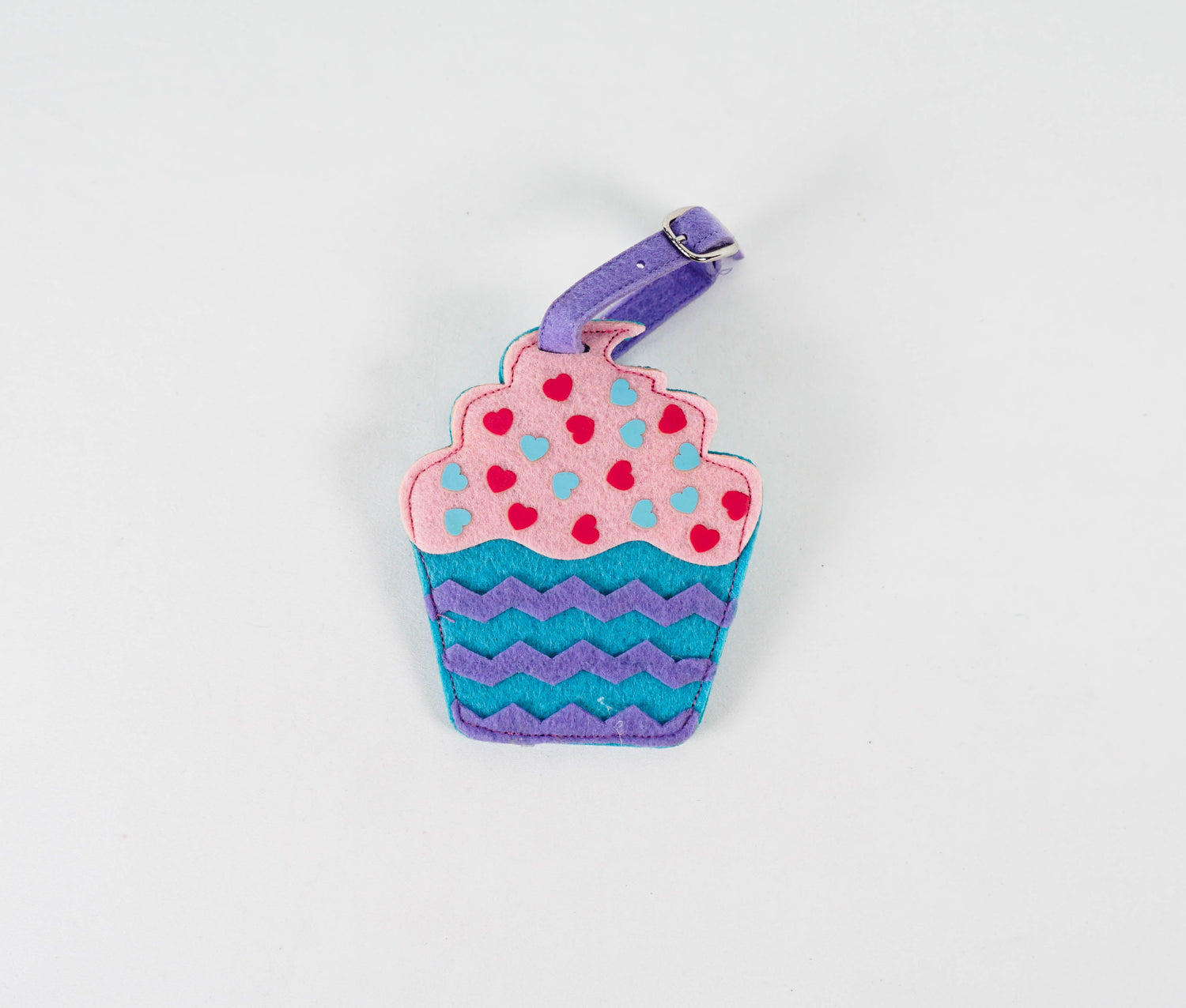 Add a dash of sweetness to any bag with this adorable bag tag! Perfect for lunchboxes, backpacks, or suitcases, our tags are made of brightly-colored, durable felt with decorative contrast stitching. A metal buckle and felt strap secures the tag to any bag, and transparent backing protects your written information from the elements. An oh-so-sweet way to make sure any bag stands out while travelling or at school.