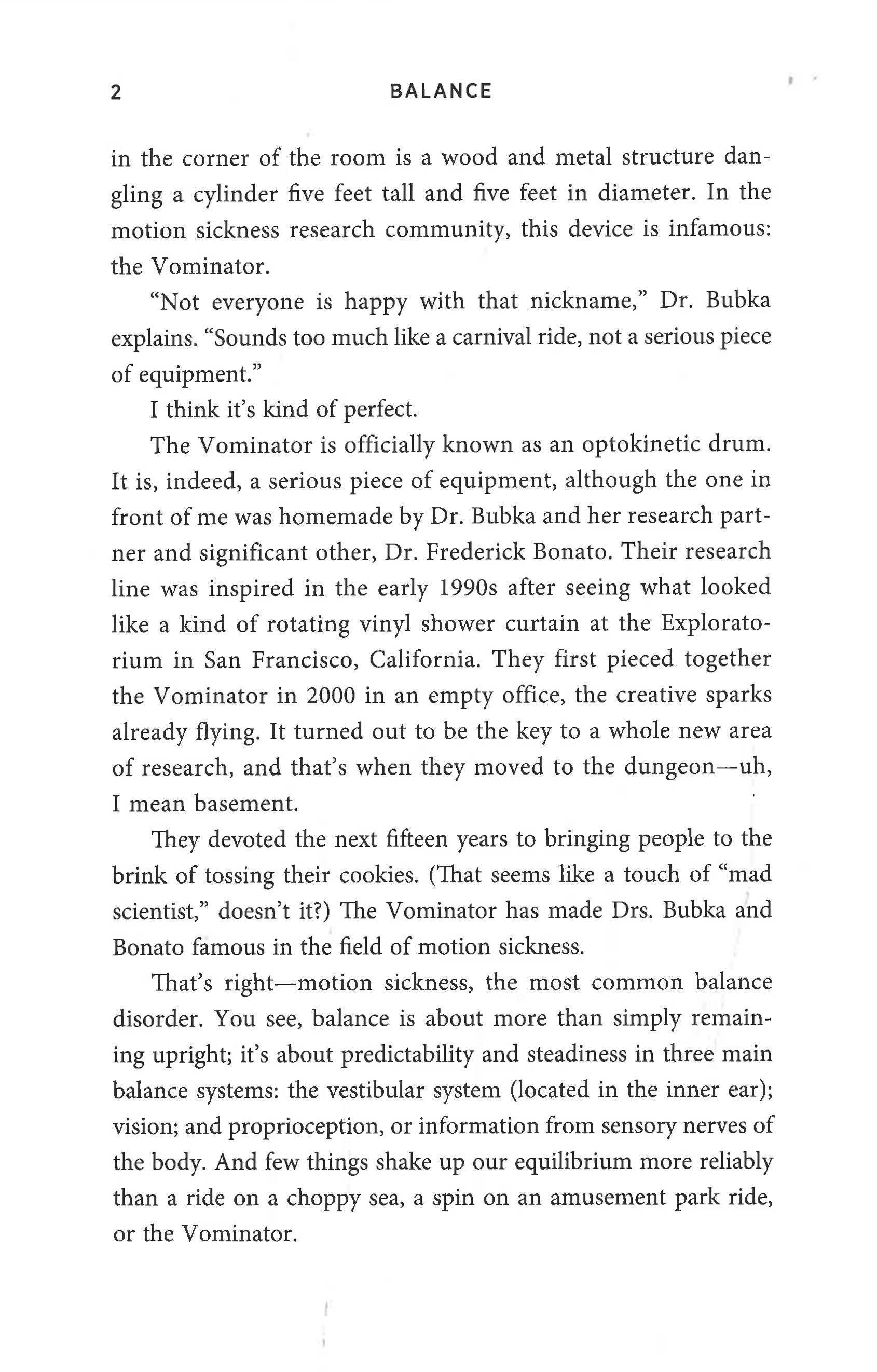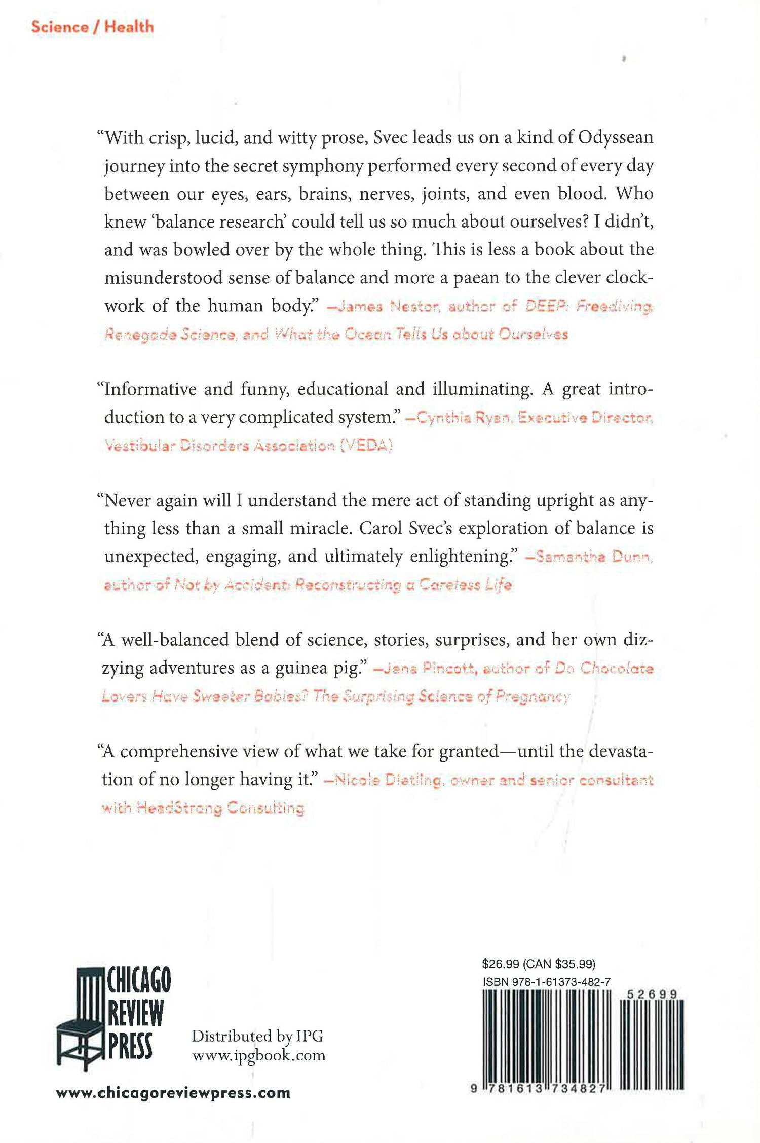Some low-frequency sounds―such as noise from storms or truck engines―can make you feel dizzy and nauseated. An index finger's light touch can stop people from losing balance. You are more prone to trip when you think someone is watching you. A breakthrough in improving balance as we age might just come through the study of the Achilles tendon. A person gets "falling down drunk" due to a tiny structure in the inner ear that floats when it becomes soaked in alcohol. These and other surprising and useful nuggets of information can be found in this lively, 360-degree exploration of our body's most intricate, overlooked sense―balance. Readers follow award-winning science and health writer Carol Svec through various facilities as she talks with leading scientists doing state-of-the-art balance research. Svec translates their most fascinating findings for the layperson in a way that is highly entertaining and broadly accessible. She showcases the coolest gadgets used by researchers as she grills an egg in a virtual kitchen, has her senses fooled by a mannequin named Hans in a Tumbling Room, survives "the Vominator" without losing her lunch, and experiences drunken dizziness inside a police muster room. Along the way she cites case studies of people whose lives are affected by balance dysfunction; explains how balance research is being applied today to help those who are ill, elderly, disabled, or simply prone to motion sickness; and provides a glimpse at what ingenious, potentially life-changing advances may be coming down the road. Whether you have a balance disorder or care about someone who does, are an athlete or performer whose livelihood depends on balance, or just love accessible, page-turning popular science, you'll be enlightened and entertained by this appreciation of our complex super-sense.