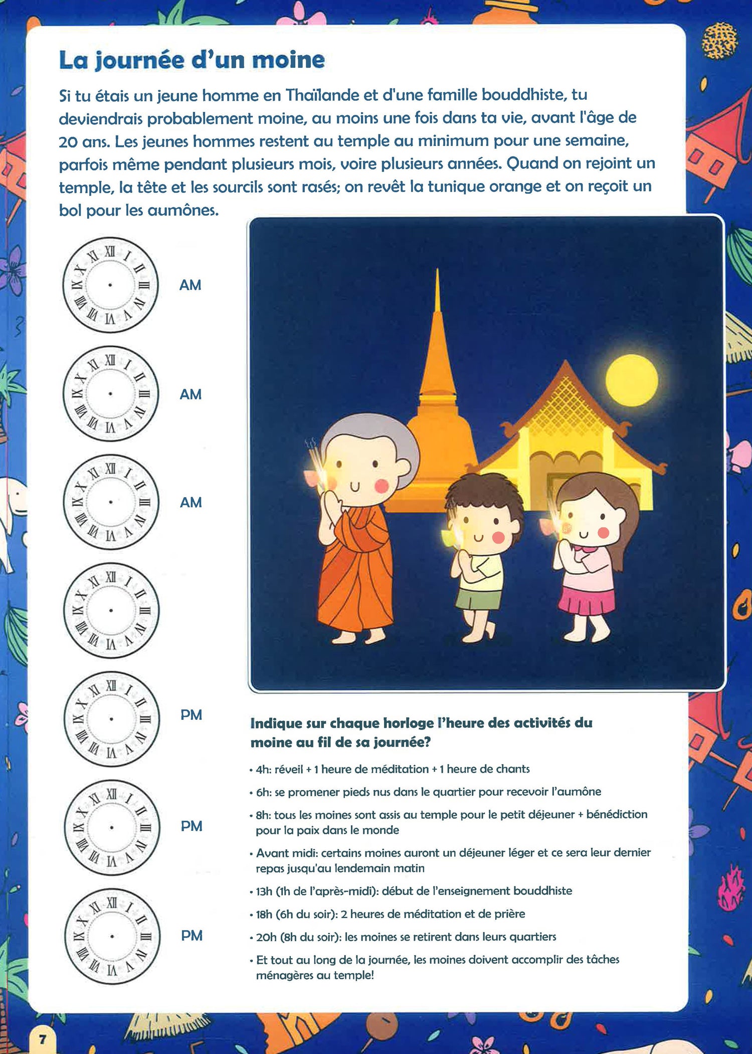 The World in the Palms of Little Hands: Activity Books for Young People. 24 pages of educational and fun games and puzzles for young people ages 6 to 12. Through the illustrated and brightly colored pages, we explore culture and customs, a bit of history, places of interest, local food, the language of the country, and much more. Globetrotter in Bangkok: What is a typical day for a monk? Look for coordinates in the floating market. Identify fried insects that are good to eat. Help a tuk-tuk find its way. Draw a royal barge on the Chao Phraya. Why is the great Buddha lying down?