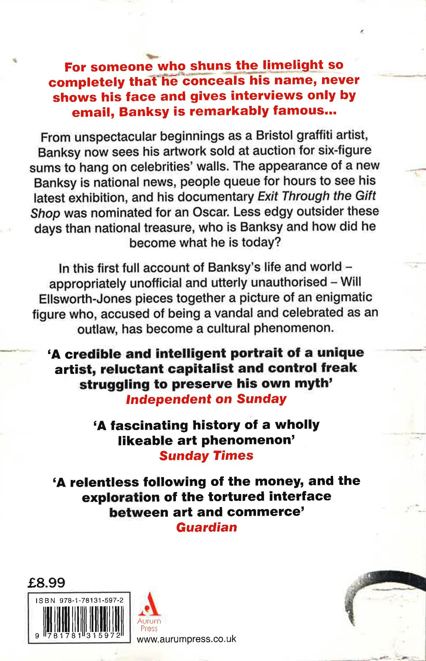 In the first attempt to tell the full story of Banksy’s life and career, Will Ellsworth-Jones pieces together a picture of his world and unpicks its contradictions. Whether art or vandalism, anti-establishment or sell-out, Banksy and his work have become a cultural phenomenon and the question ‘Who is Banksy?’ is as much about his career as it is ‘the man behind the wall’.