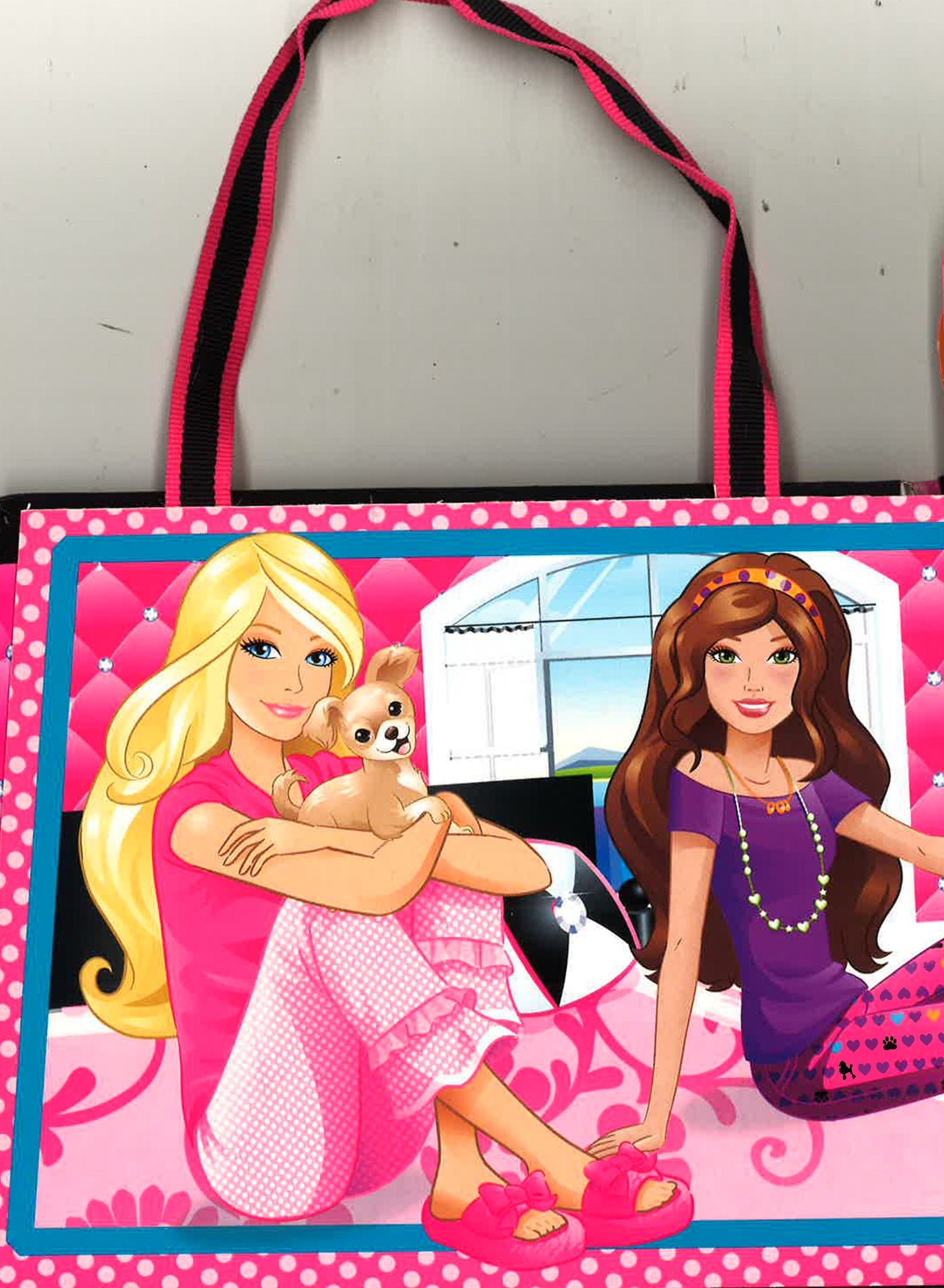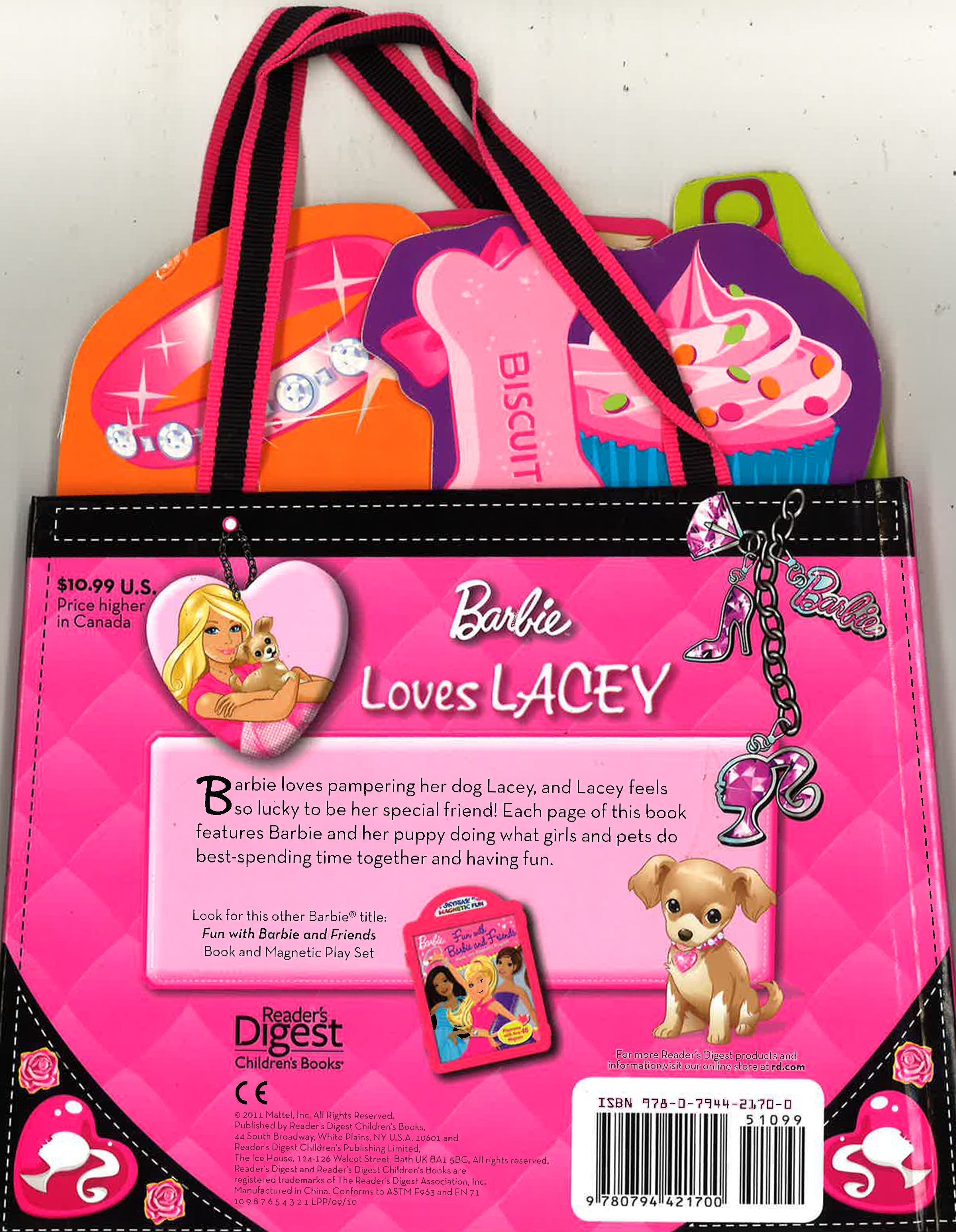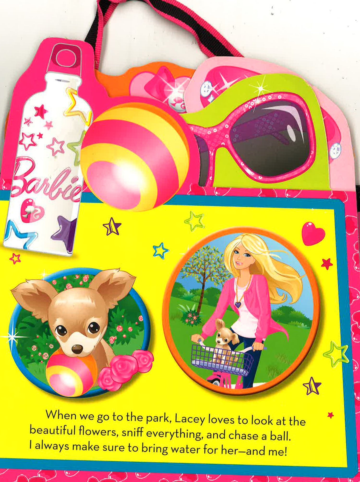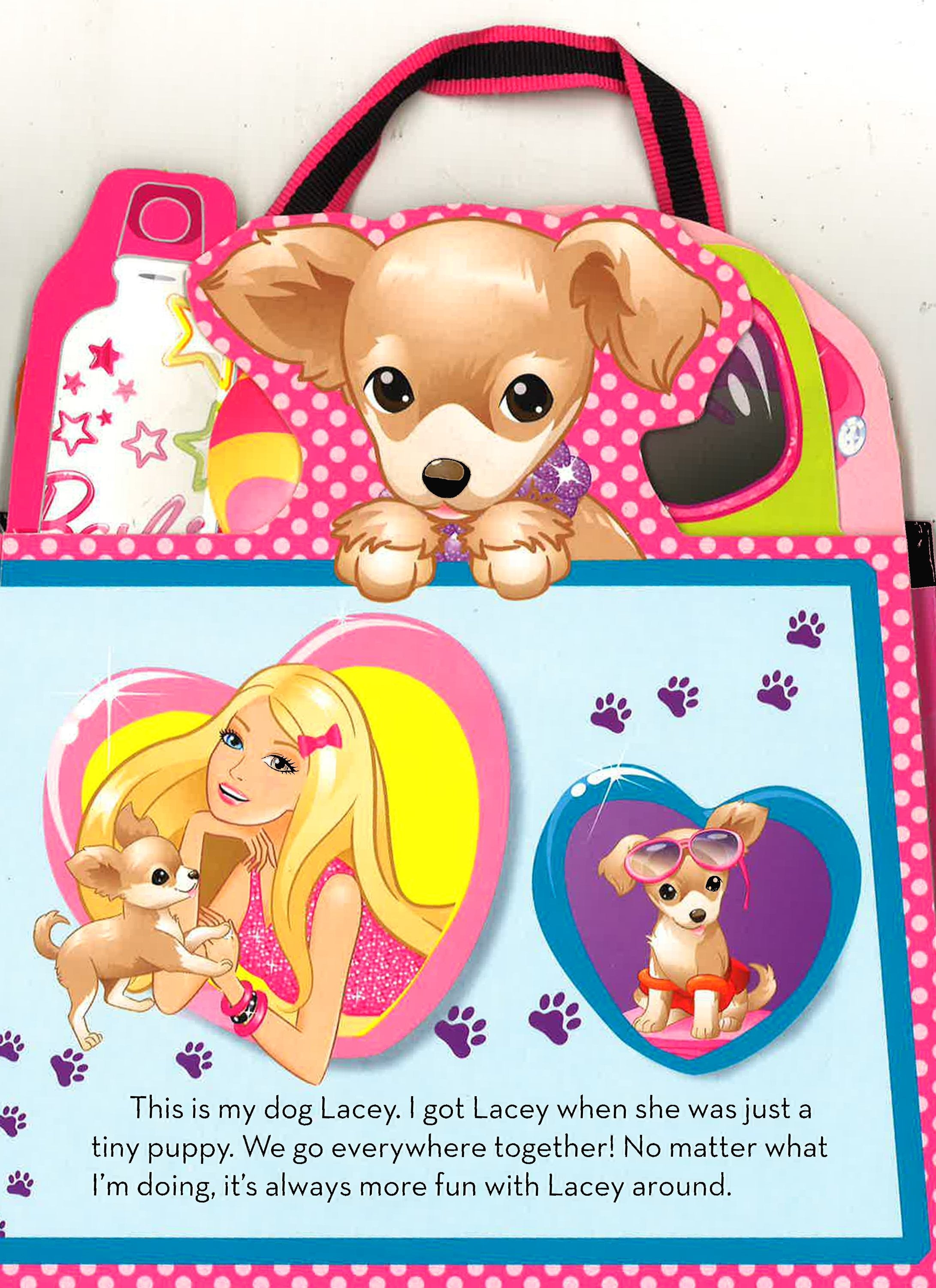 This vibrant die-cut purse-shaped book features Barbie's dog Lacey. The fabric handles and glitter add to the girly appeal. Barbie loves pampering her dog Lacey, and Lacey feels so lucky to be Barbie's special friend! Each board page of this glittery purse-shaped book focuses on the fun of having a pet. This original story features Barbie and her puppy doing what girls and pets do best-- spending time together and having fun.