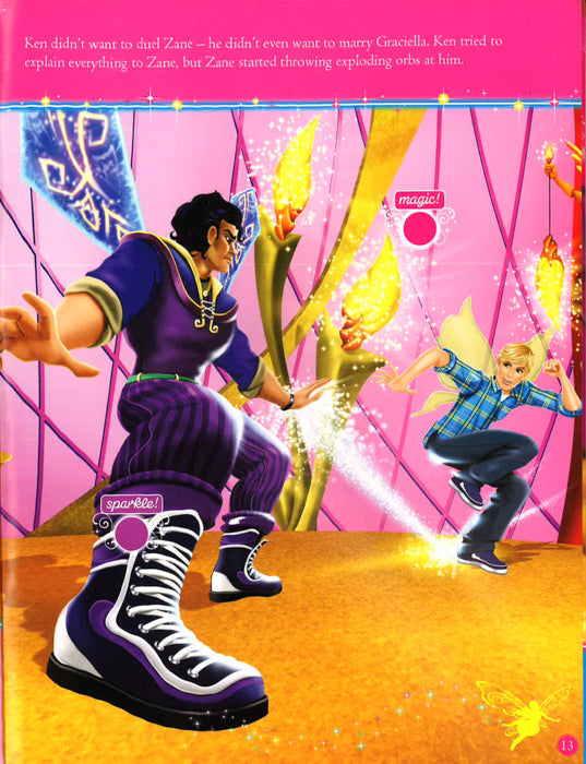 A red carpet event, a secret fairy world and a daring rescue by Barbie herself - this fast-paced adventure has it all! When Ken is kidnapped by a drugged-up fairy queen Barbie and her frenemy Raquel will have to put their differences aside to save him. An adorable magic wand adds great play value to this book as girls wave it over the pages to create different sparkling sounds!Includes a gorgeous plush magical wand that brings the book alive! Includes sound 'spots' that you wave the wand over to activate 5 magical sounds.Each page is bursting with beautiful bright artwork to inspire imagination.