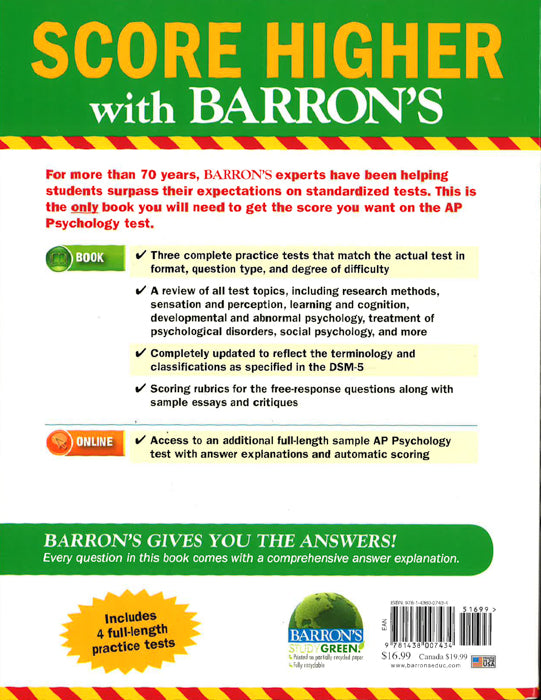 This updated guide offers content and test questions based on the most recent version of the AP Psychology course objectives. Our latest edition includes: Three full-length practice exams--one diagnostic test and two full-length practice tests Comprehensive answer explanations for all questions A review of all AP test topics, including research methods, the biological basis of behavior, and treatment of disorders An abnormal psychology chapter completely overhauled to reflect the latest changes to the DSM-5 Fifteen additional multiple-choice practice questions for each unit with explained answers An analysis of the test's essay section with a sample essay The manual can be purchased alone or with an optional CD-ROM that presents two additional full-length practice tests with automatic scoring and fully explained answers.