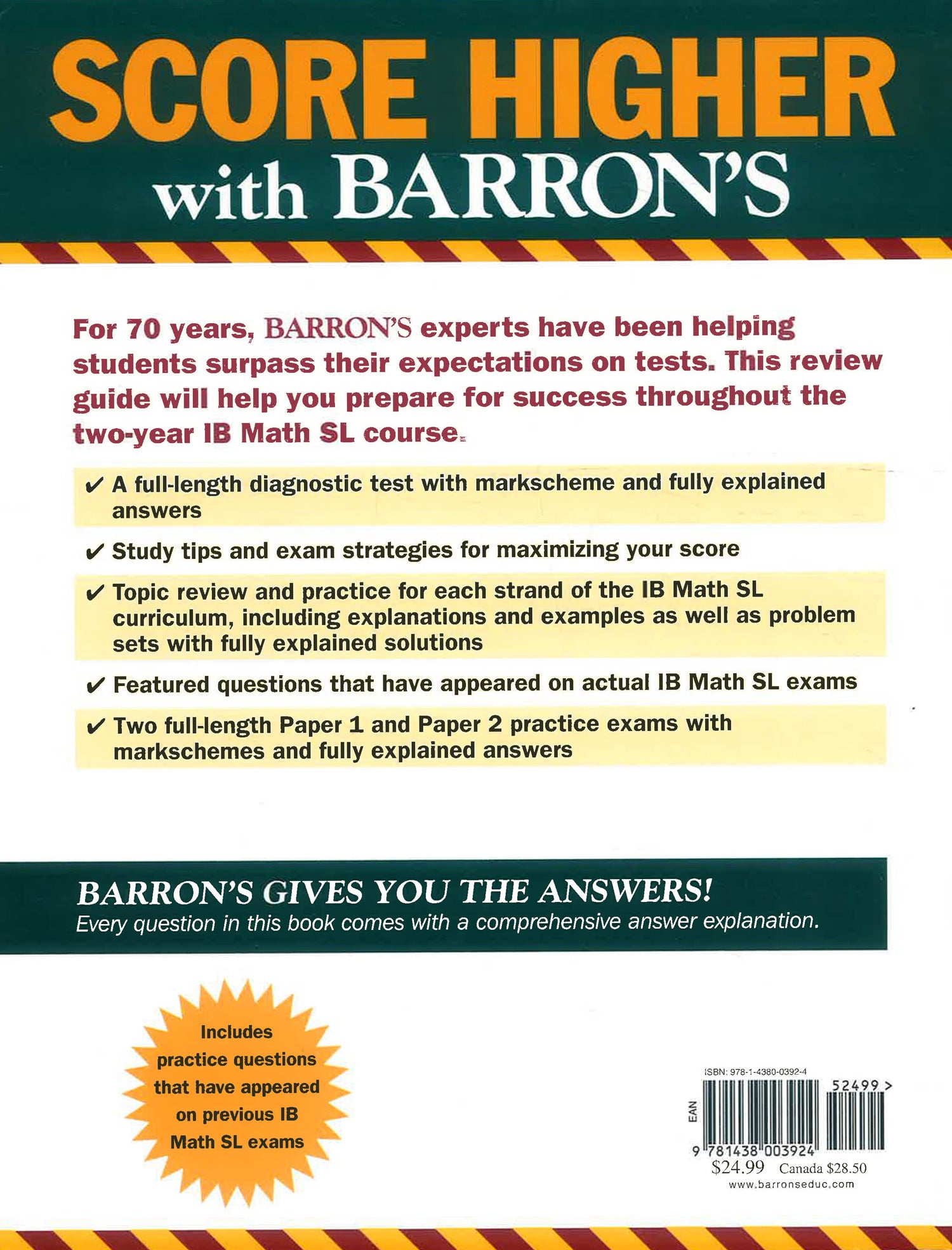 The International Baccalaureate® (IB) was founded in Geneva, Switzerland in 1968 as a non-profit educational foundation that endeavored to develop inquiring, knowledgeable and caring young people who would go on to create a better and more peaceful world through intercultural understanding and respect. What began as a single program for internationally mobile students preparing for college has grown into a series of programs for students up to age 19. Barron’s is pleased to offer a brand new course review and exam preparation guide for the IB Mathematics SL exam. The content of the book is based on the subject guide, published by the International Baccalaureate Organization. It covers all topics required for exams beginning in 2014 and includes:
