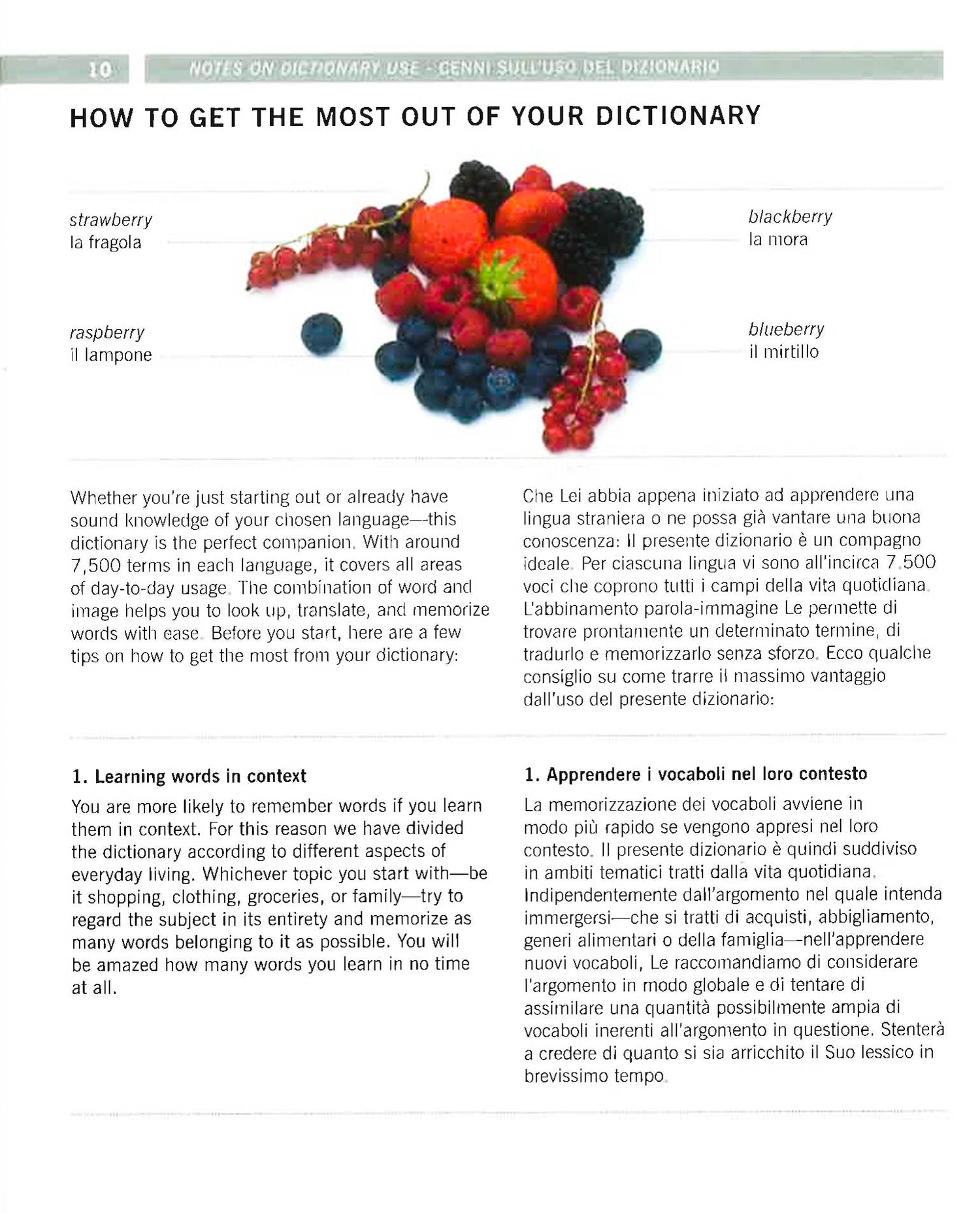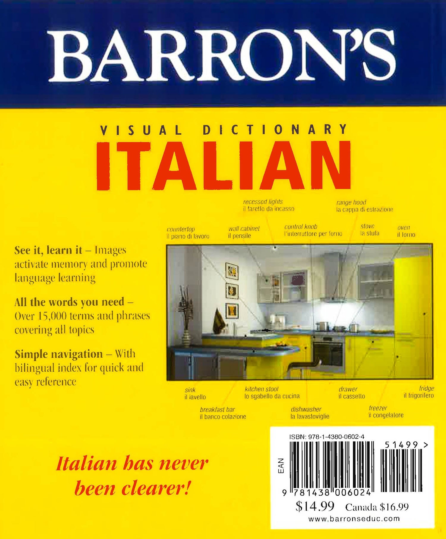Travelers, students, and lovers of language will find this little visual dictionary to be indispensable. Small enough to slip into a purse or satchel, it includes thousands of common words identified by pictures and defined bilingually. Barron's Visual Dictionary: Italian features approximately 15,000 words and concepts sorted into 13 clearly formatted and color-coded categories. Color-coded page headers make it quick and easy to find words in each category, from people, food, and communication, to education, leisure, and sports. This book also features: