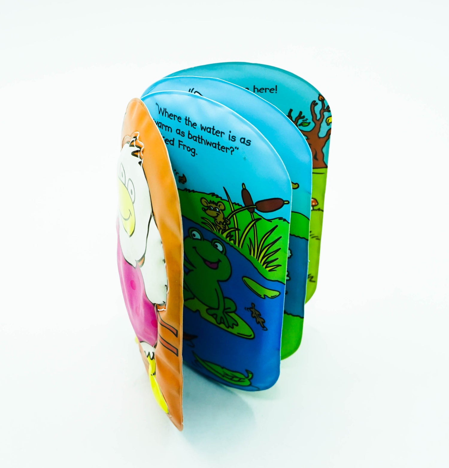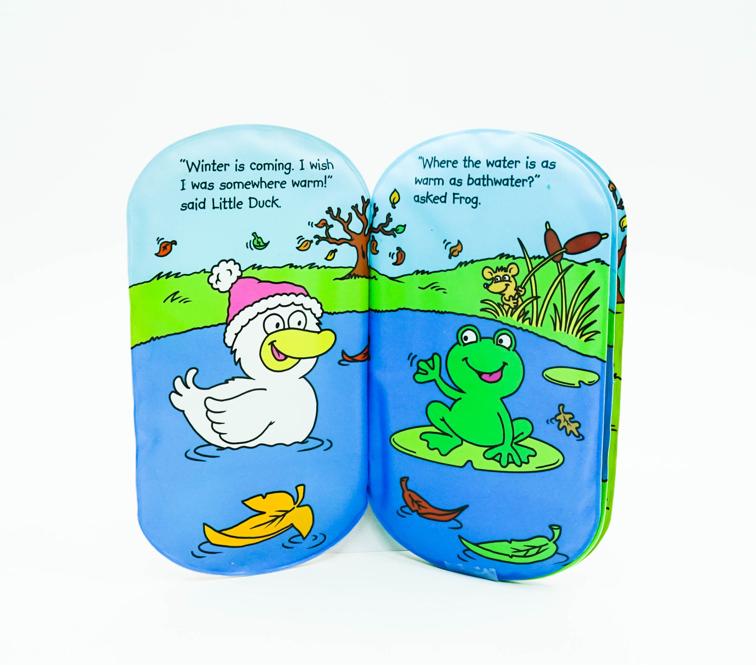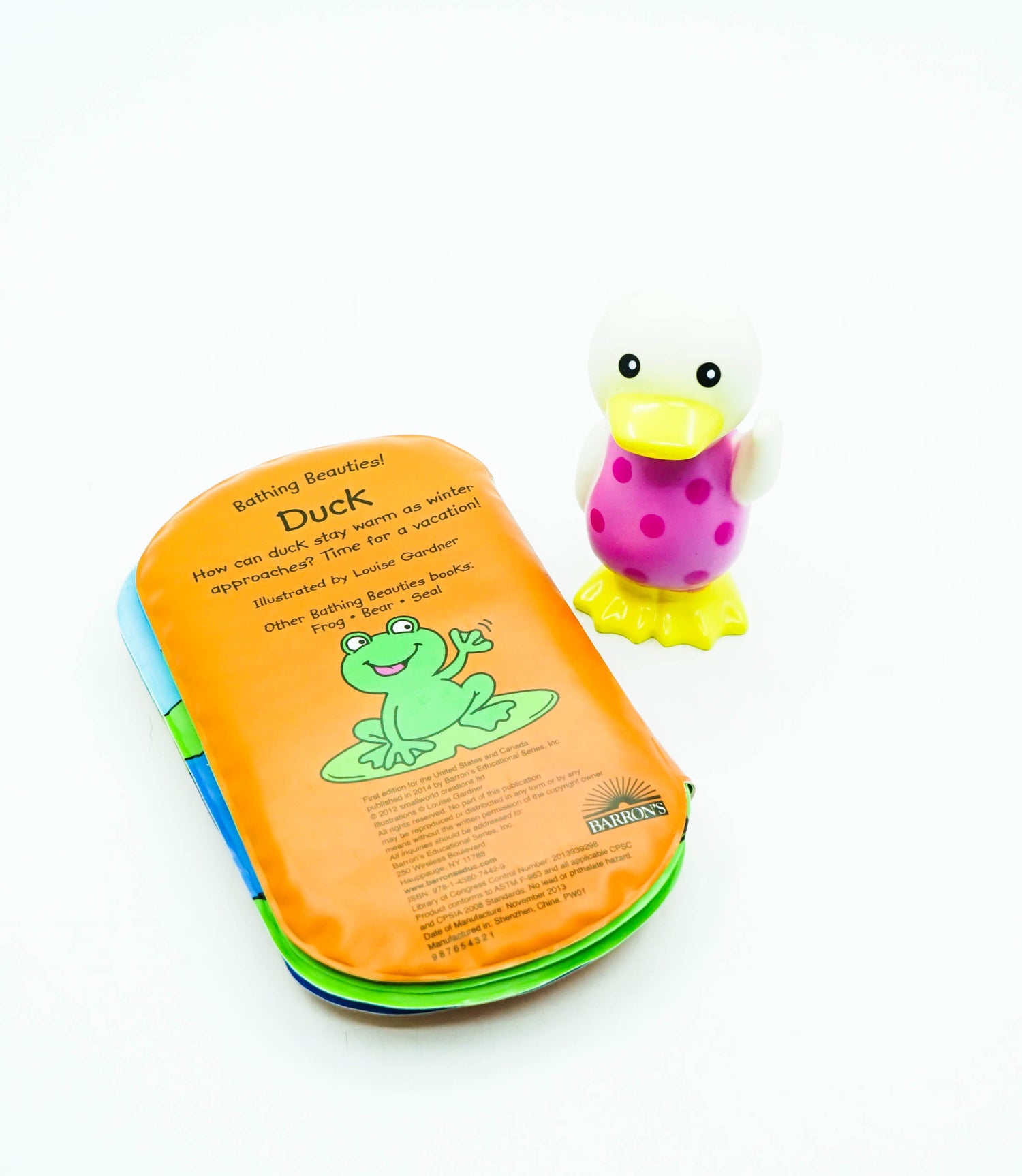 Little ones are in for double the fun in the tub or kiddie pool with this cute bath set. A waterproof, vinyl book provides cool reading about the adventures of Duck. Includes a fun Duck bath squirty! Net bag included for easy, drip-dry storage.