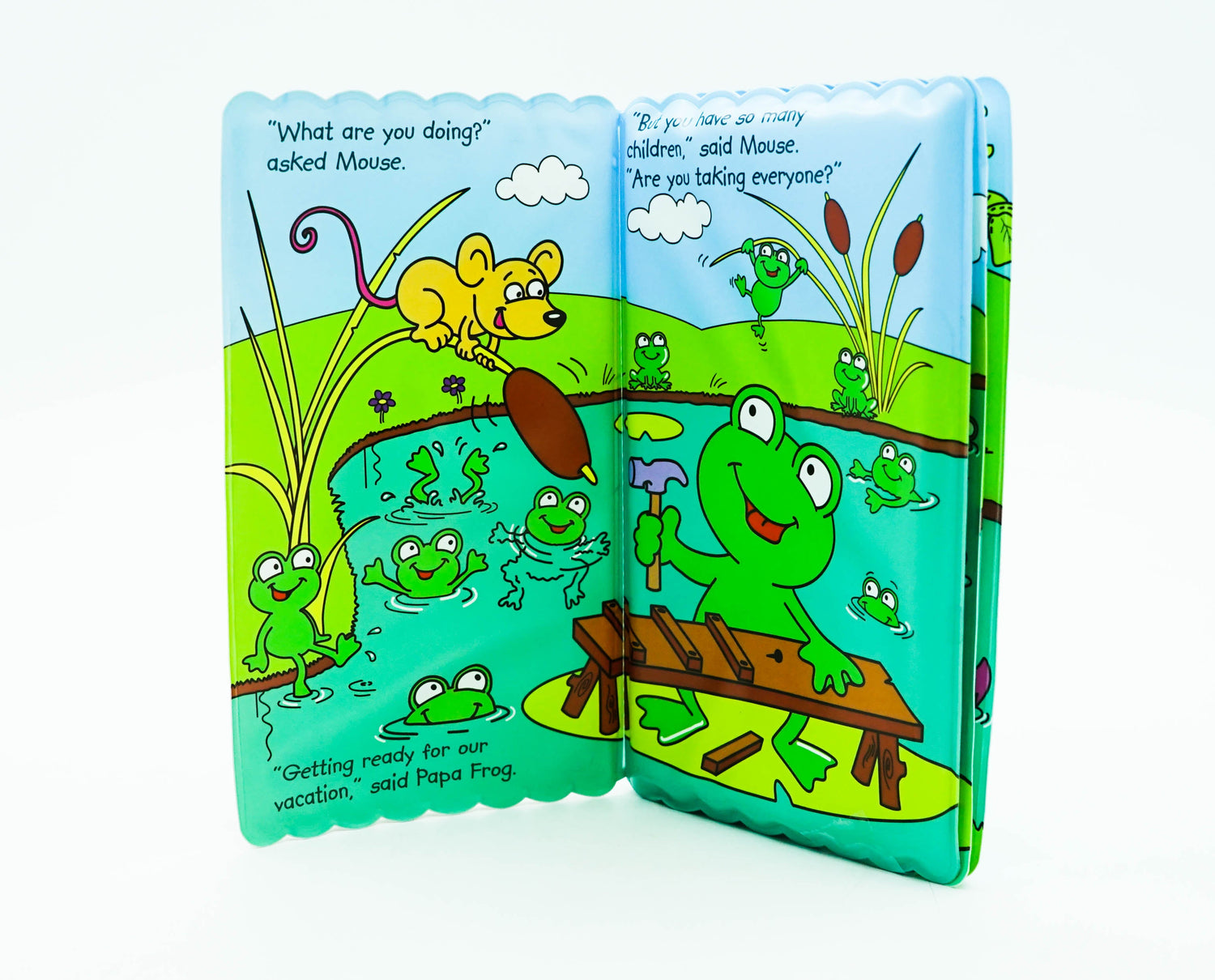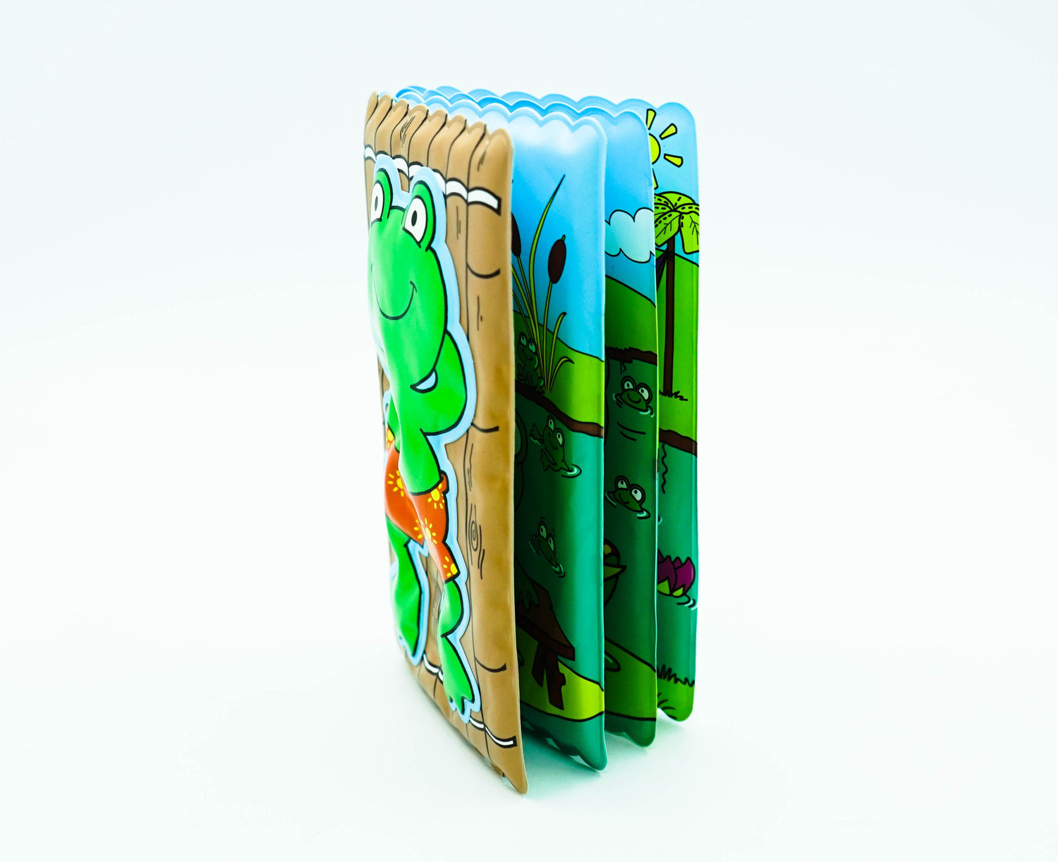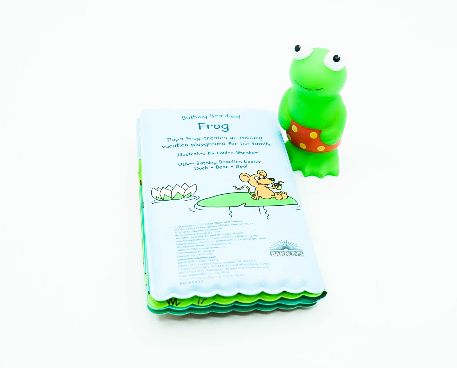 Little ones are in for double the fun in the tub or kiddie pool with this cute bath set. A waterproof, vinyl book provides cool reading about the adventures of Frog. Includes a fun Frog bath squirty! Net bag included for easy, drip-dry storage.