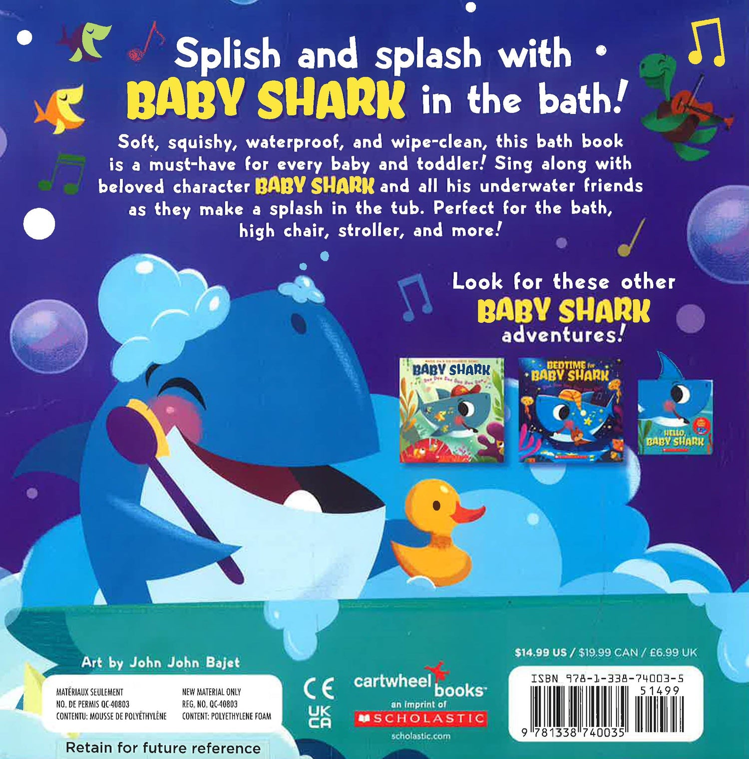 Splish and splash with beloved character Baby Shark and all his underwater friends and this durable bath book. Perfect for the bath, high-chair, stroller, park, and any time spent