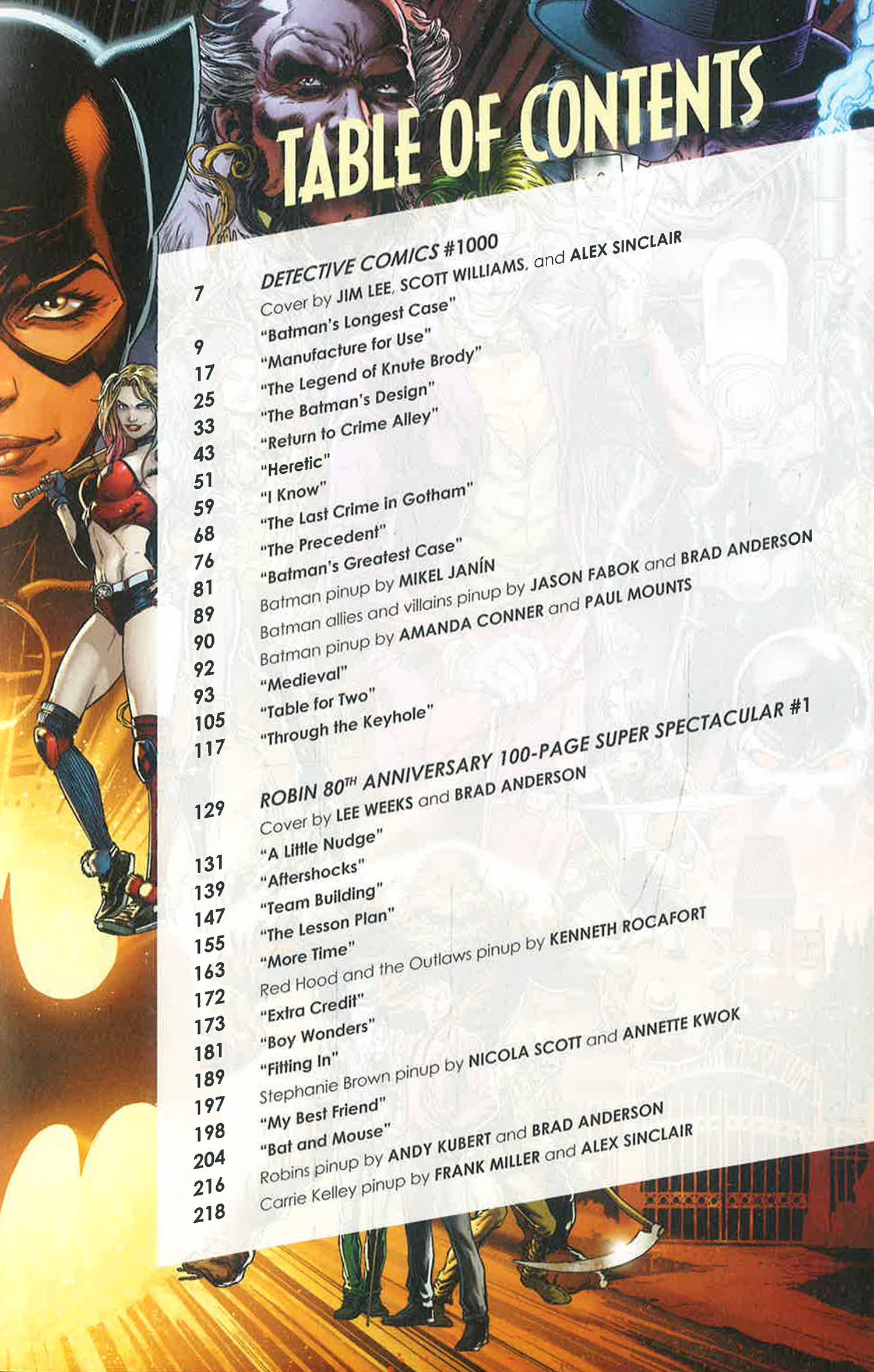 Collects Detective Comics #1000, Detective Comics #1000: The Deluxe Edition #1, Detective Comics: 80th Anniversary Giant #1, Robin 80th Anniversary 100-Page Super Spectacular #1, Catwoman 80th Anniversary 100-Page Super Spectacular #1, The Joker 80th Anniversary 100-Page Super Spectacular #1, as well as art from your favorite artists!