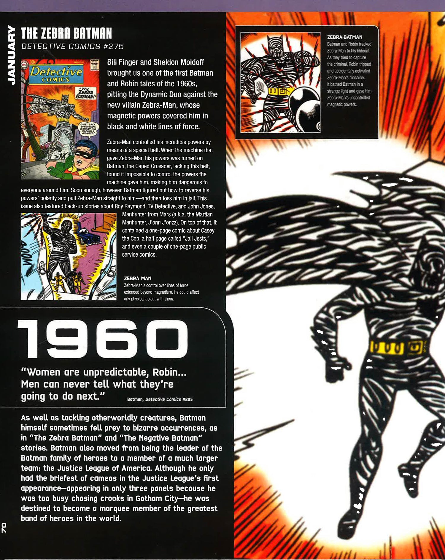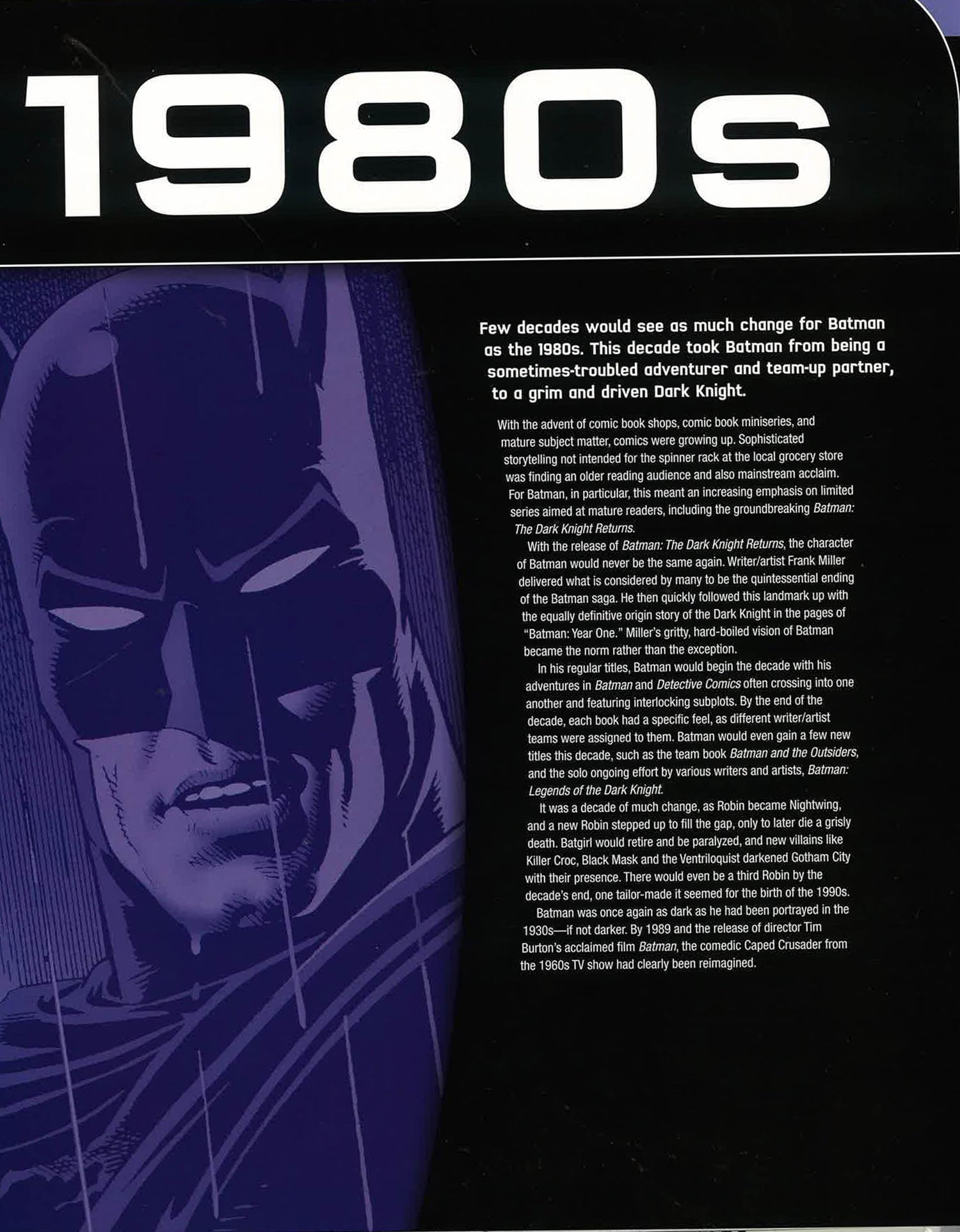 Decade by decade, year by year, month by month, explore the evolution of the World's Greatest Detective, his heroic Bat-Family, and his unforgettable gallery of rogues, such as the Joker, Harley Quinn, Catwoman, Bane, Scarecrow