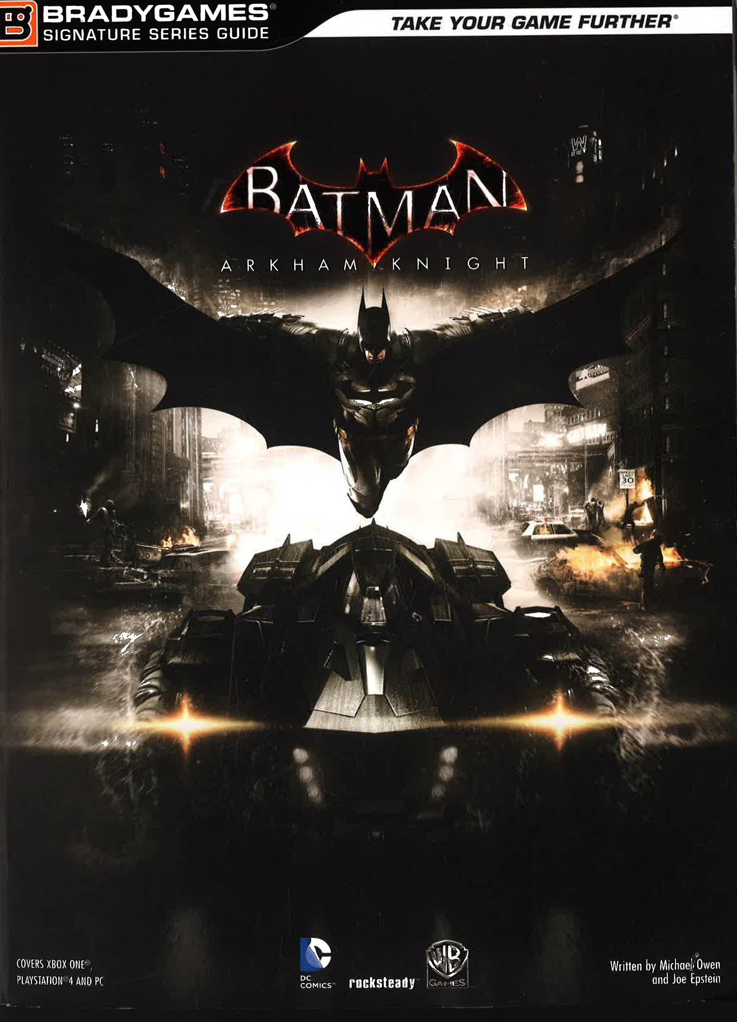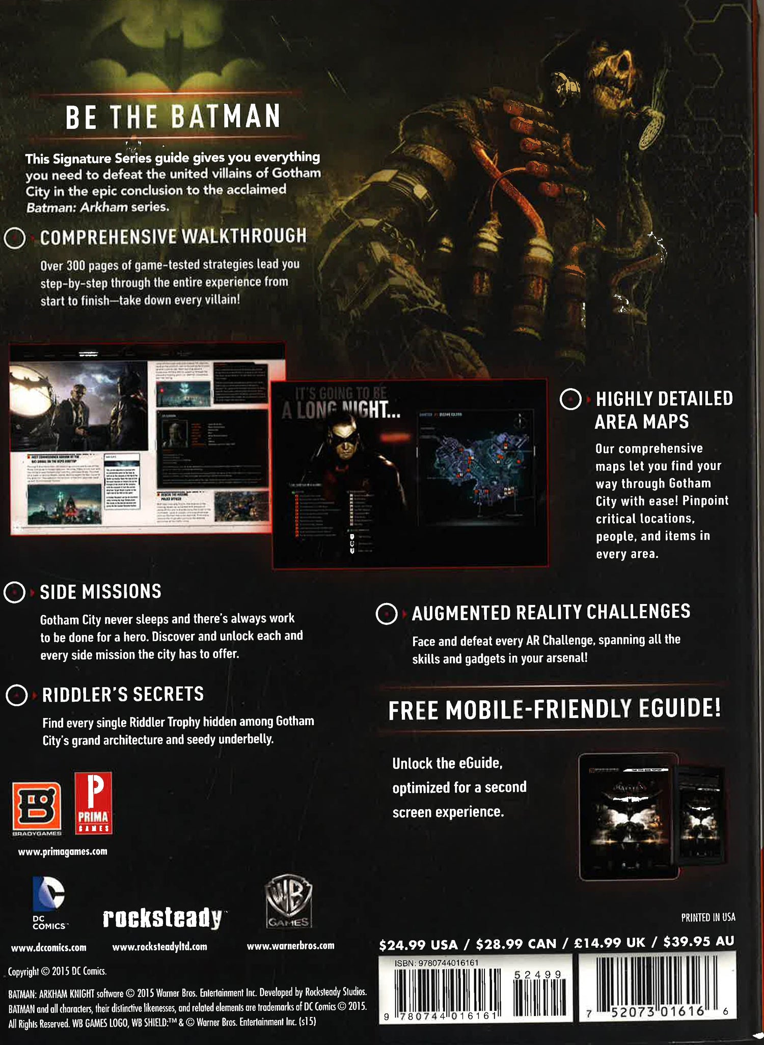 The Batman: Arkham Knight Signature Series Guide includes: BE THE BATMAN - This Signature Series guide gives you everything you need to defeat the united villains of Gotham City in the epic conclusion to the acclaimed Batman: Arkham series. Comprehensive Walkthrough - Over 300 pages of game-tested strategies lead you step-by-step through the entire experience from start to finish--take down every villain! Highly Detailed Area Maps - Our comprehensive maps let you find your way through Gotham City with ease! Pinpoint critical locations, people, and items in every area. Side Missions - Gotham City never sleeps and there's always work to be done for a hero. Discover and unlock each and every side mission the city has to offer. Augmented Reality Challenges - Face and defeat every AR Challenge, spanning all the skills and gadgets in your arsenal!