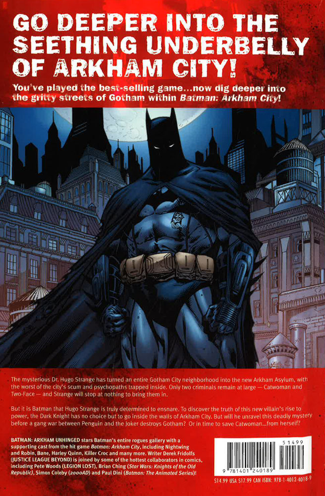 You've played the bestselling game...now dig deeper into Batman: Arkham City's gritty streets of Gotham The mysterious Dr. Hugo Strange has turned an entire Gotham City neighborhood into the new Arkham Asylum, with the worst of the city's scum and psychopaths are trapped inside. Only two criminals remain at large -- Catwoman and Two-Face -- and Strange will stop at nothing to bring them in. To discover the truth of this new villain's rise to power, the Dark Knight has no choice but to go inside the walls of Arkham City. But will he unravel this deadly mystery before a gang war between Penguin and the Joker destroys Gotham? Or in time to save Catwoman...from herself? BATMAN: ARKHAM UNHINGED stars Batman's entire rogues gallery with a supporting cast from the hit game Batman: Arkham City, including Nightwing and Robin, Bane, Harley Quinn, Killer Croc and many more. Writer Derek Fridolfs (JUSTICE LEAGUE BEYOND) is joined by some of the hottest collaborators in comics, including Pete Woods (LEGION LOST), Brian Ching (Star Wars: Knights of the Old Republic), Simon Coleby (2000AD) and Paul Dini (Batman: The Animated Series)!
