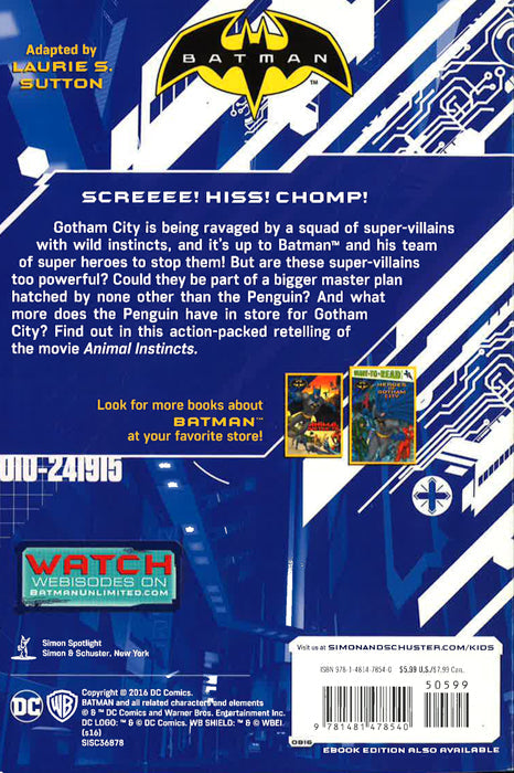 Screeee! Hiss! Chomp! Gotham City is being ravaged by a squad of super-villains with wild animal instincts and it’s up to Batman and his team of heroes to stop them! But are these super-villains too powerful? Could they be part of a bigger master plan hatched by none other than the Penguin? And what more does the Penguin have in store for Gotham City? Find out in this chapter book with full-color illustrations throughout!