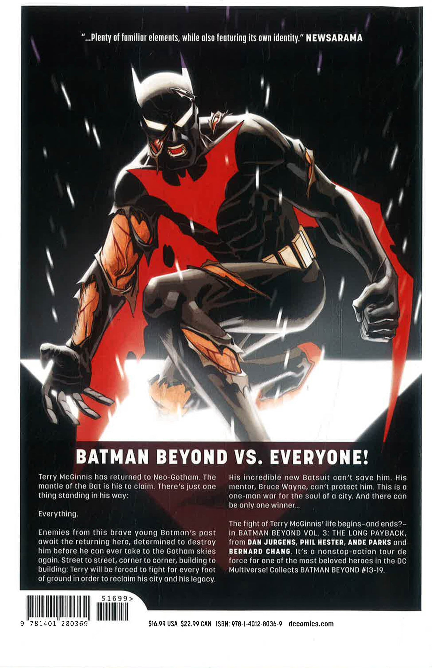 The fight of Terry McGinnis's life begins -- and ends? -- in Batman Beyond Vol. 3: The Long Payback, from the creative team of Dan Jurgens and Bernard Chang. It's a non-stop action tour-deforce for one of the most beloved heroes in the DC Multiverse! Collecting Batman Beyond #13-19.