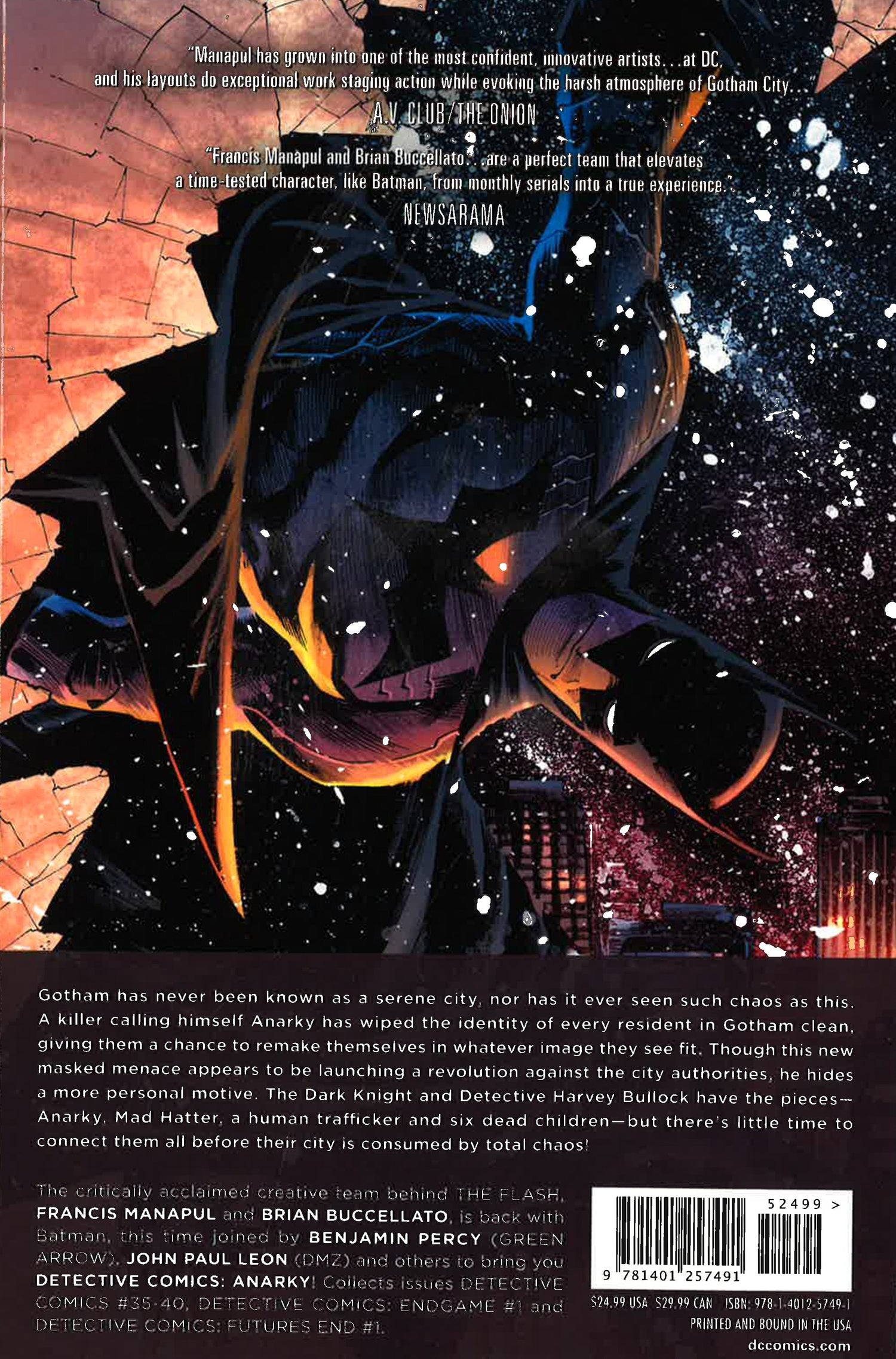 Award-winning creative team of Francis Manapul and Brian Buccellato continue their groundbreaking run on DETECTIVE COMICS with the return of a longlost Batman villain, Anarky. As Gotham City decends into chaos at the hands of Anarky and his quest for revenge on both the villains and protectors of Gotham. Batman must team up with the cantankerous Harvey Bullock of the Gotham City PD to find Anarky's true motivation for bringing Gotham to it's knees. Collects issues #35-40.