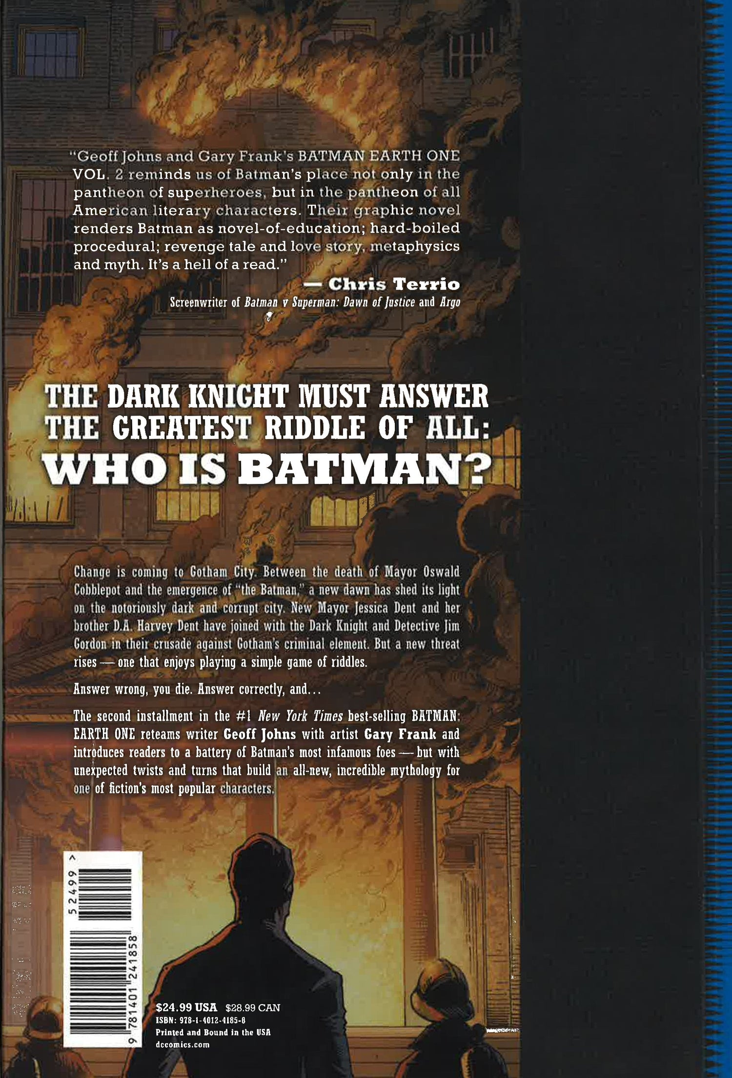 The Riddler has arrived in Gotham and he's terrorizing the city with his own twisted brand of anarchy. But why is he attacking now, and what is his endgame? The Riddler isn't Batman's only problem, as Killer Croc is on the streets and his violent crimes can't be ignored. Meanwhile, the Dark Knight has trouble reconciling the increasingly conflicting ideologies of Alfred Pennyworth and James Gordon in this gripping re-imagining of the Batman mythology. Writer Geoff Johns and artist Gary Frank bring you Batman as you've never seen him before in this thrilling original graphic novel that continues their unique take on the Dark Knight.