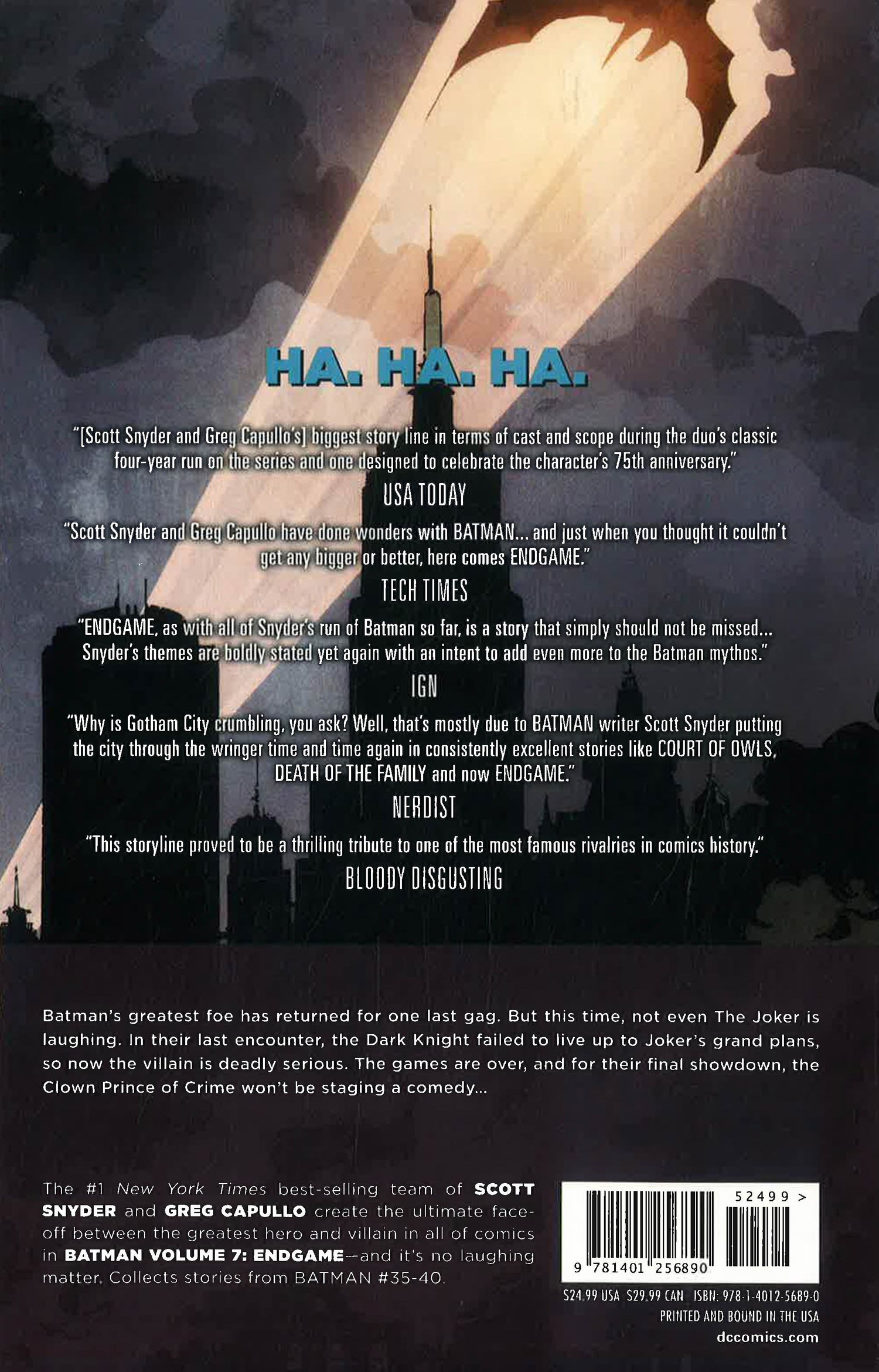 Batman’s greatest foe has returned for one last gag - but this time, not even the Joker is laughing. In their last encounter, the Dark Knight failed to live up to the Joker’s grand plans, so now the Joker is deadly serious. The games are over and, for their final showdown, the Clown Prince of Crime won’t be staging a comedy. No more macabre mind games. No more perverse pranks. The crazed killer who has elevated evil to an art is about to paint his masterpiece: the utter destruction of Batman and everything he holds dear. He’ll turn the Justice League against Batman. He’ll turn the people of Gotham into giggling psychopaths. But that’s just the setup-the punchline is even more terrifying.The #1 New York Times best-selling team of Scott Snyder and Greg Capullo create the ultimate face-off between the greatest hero and villain in all of comics in BATMAN VOLUME 7: ENDGAME - and it’s no laughing matter. Collects stories from BATMAN #35-40.
