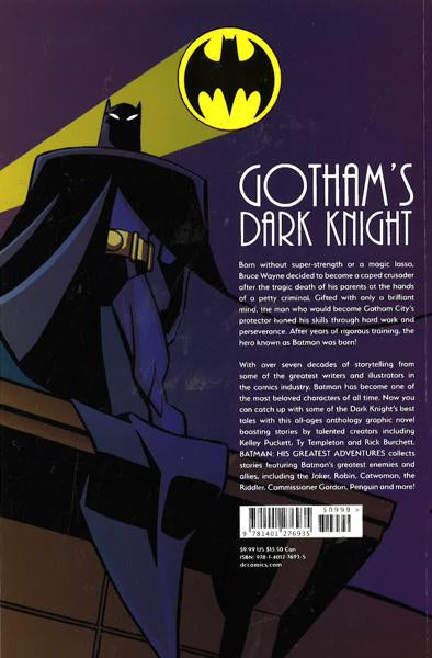 The best of Batman's adventures and trials are here in BATMAN: HIS GREATEST ADVENTURES, an all-ages anthology graphic novel. With over seven decades of storytelling from some of the greatest writers and illustrators in comics industry, Batman has become one of the most beloved characters of all time. Now you can catch up with some of the Dark Knight's best tales with this collection, which boasts stories by talented creators including Kelley Puckett, Ty Templeton and Rick Burchett. Born without super-strength or a magic lasso, Bruce Wayne decided to become a caped crusader after the tragic death of his parents at the hands of a petty criminal. Gifted with only a brilliant mind, the man who would become Gotham City's protector honed his skills through hard work and perseverance. After years of rigorous training, the hero known as Batman was born! BATMAN: HIS GREATEST ADVENTURES includes stories featuring Batman's greatest enemies and allies, including the Joker, Robin, Catwoman, the Riddler, Commissioner Gordon, Penguin and more! Collects BATMAN ADVENTURES #3, BATMAN ADVENTURES #11, BATMAN ADVENTURES #19, BATMAN AND ROBIN ADVENTURES #4, BATMAN BEYOND #1 and THE BATMAN STRIKES #6.