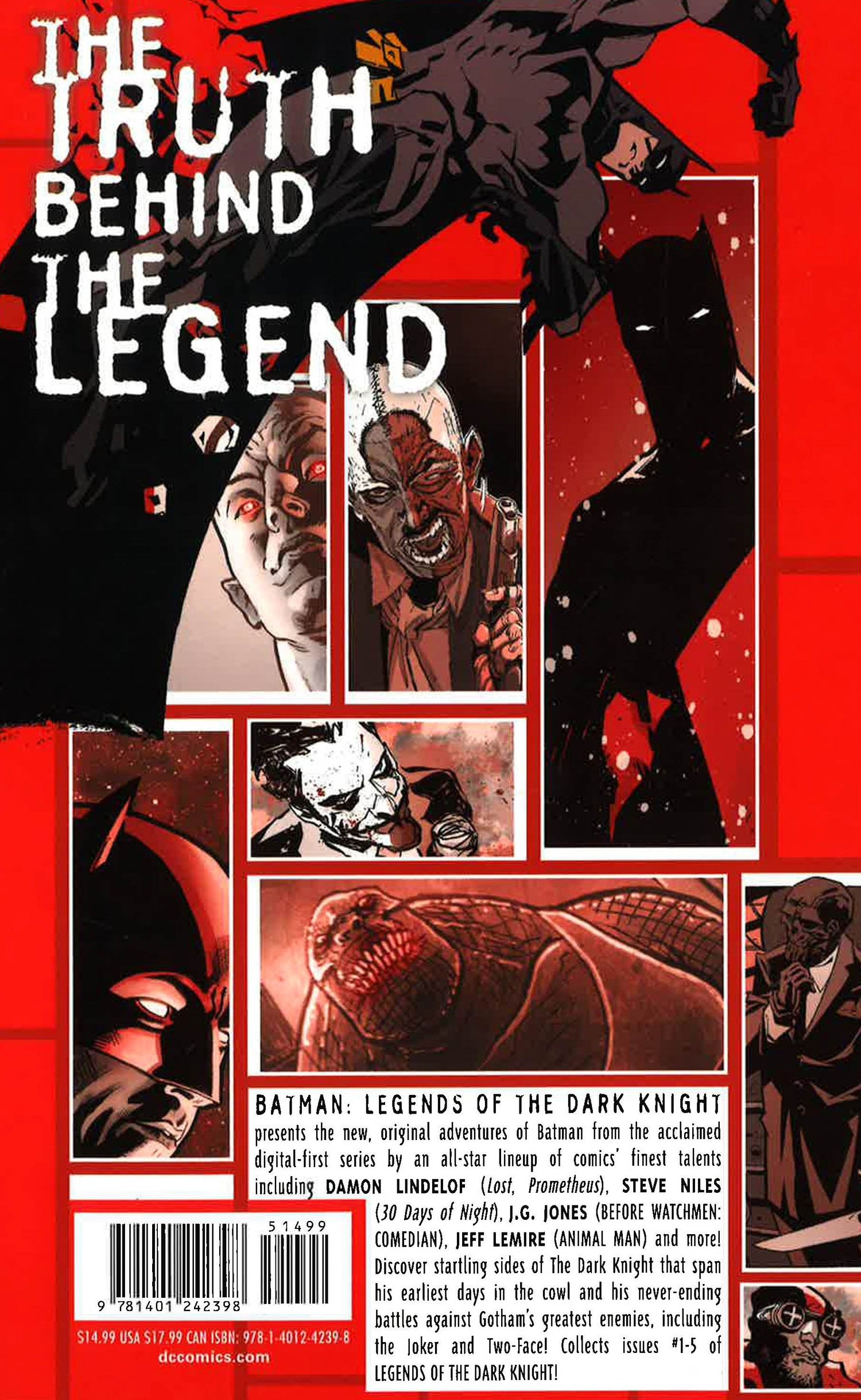 These new tales of Batman from writers including Damon Lindelof (Lost, Prometheus), Steve Niles (30 Days of Night) Andrew Dabb (Supernatural), and others explore unusual sides of The Dark Knight, including his relationship with Alfred during his early years as a crimefigher, his method of dealing with super-powered foes, and more. Collects LEGENDS OF THE DARK KNIGHT #1-5.
