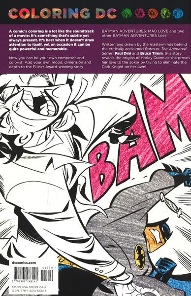 DC Comics presents classic adventures in a whole new way: in black and white, on heavy stock suitable for coloring! This adult coloring book features the popular characters Batman, Joker and Harley Quinn, drawn in the style popularized by Bruce Timm from BATMAN: THE ANIMATED SERIES! This Eisner Award-winning tale includes the origin of Harley Quinn from MAD LOVE, plus stories from BATMAN ADVENTURES ANNUAL #1 and BATMAN ADVENTURES HOLIDAY SPECIAL #1.