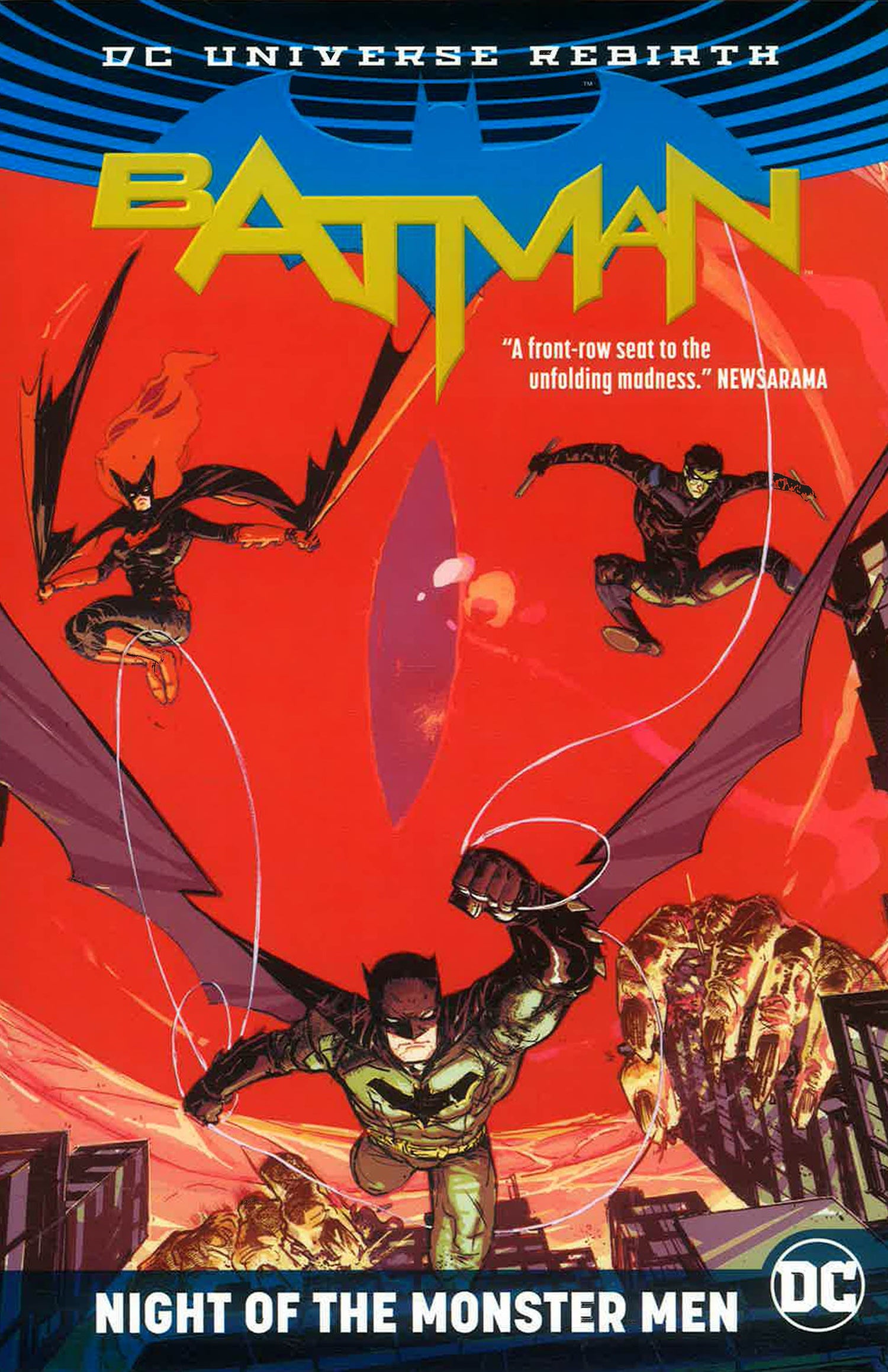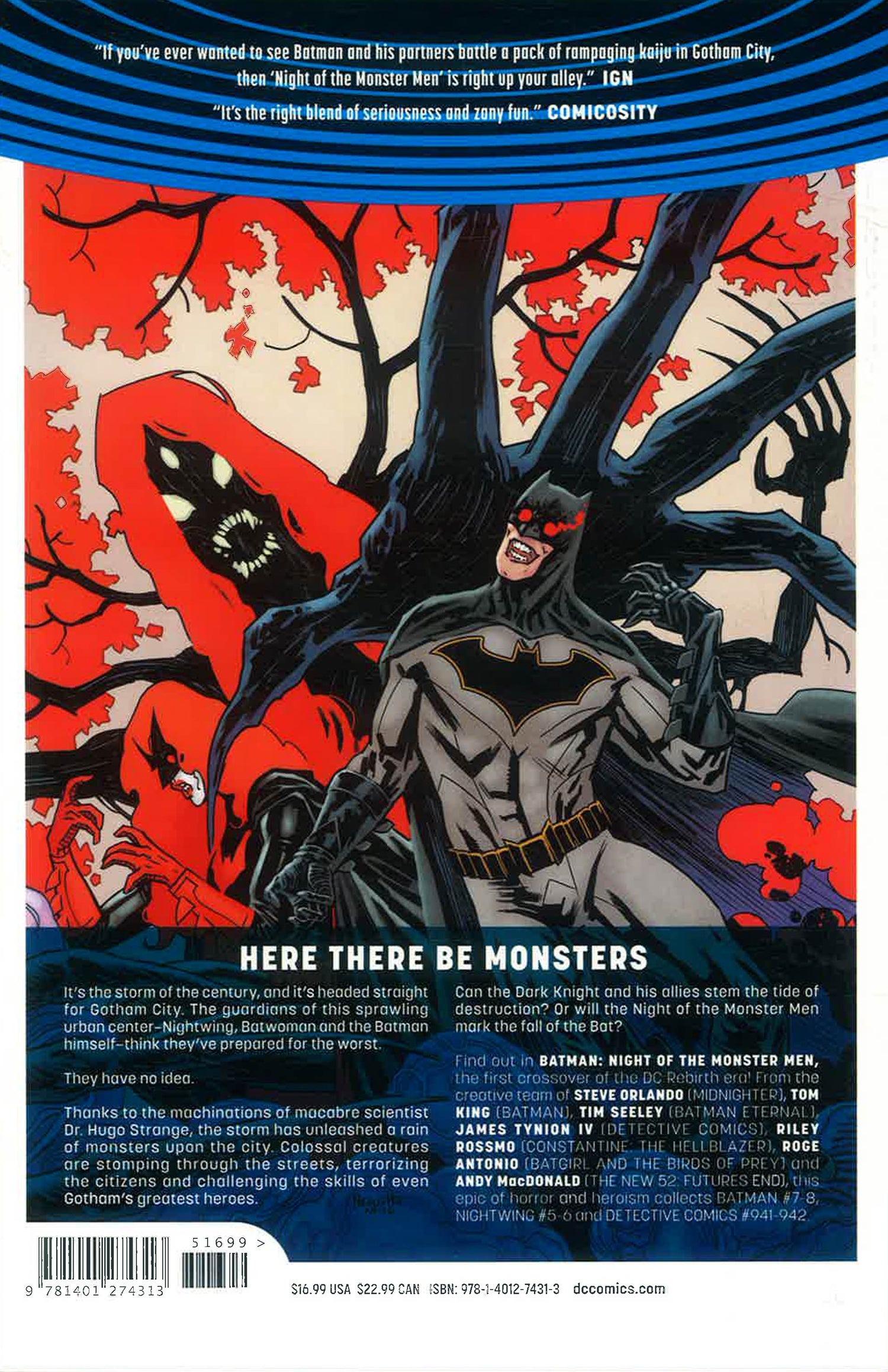 Find out in BATMAN: NIGHT OF THE MONSTER MEN, the first crossover of the DC Rebirth era! From the creative team of Steve Orlando (MIDNIGHTER), Tom King (BATMAN), Tim Seeley (BATMAN ETERNAL), James Tynion IV (DETECTIVE COMICS), Riley Rossmo (CONSTANTINE: THE HELLBLAZER), Roge Antonio (BATGIRL AND THE BIRDS OF PREY) and Andy MacDonald (THE NEW 52: FUTURES END), this epic of horror and heroism collects BATMAN #7-8, NIGHTWING #5-6 and DETECTIVE COMICS #941-942.