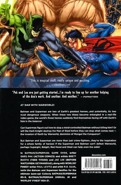 The Dark Knight and the Man of Steel uncover a plot by the Toymaster to use a secret, potentially deadly element in his new video game - the characters created by players manifest in real life. The ultimate fighting game results - and a world-wide network of players must team up to create the most powerful, skilled Super Heroes imaginable with one goal: To kill Batman. When Batman and Superman are corned by the Toymaster and Mongul, they are pitted against on another in a battle to the death, with their only hope being the The Worlds' Finest. Collects Batman/Superman #5-9, Batman/Superman Annual #1, Worlds' Finest #20-21.