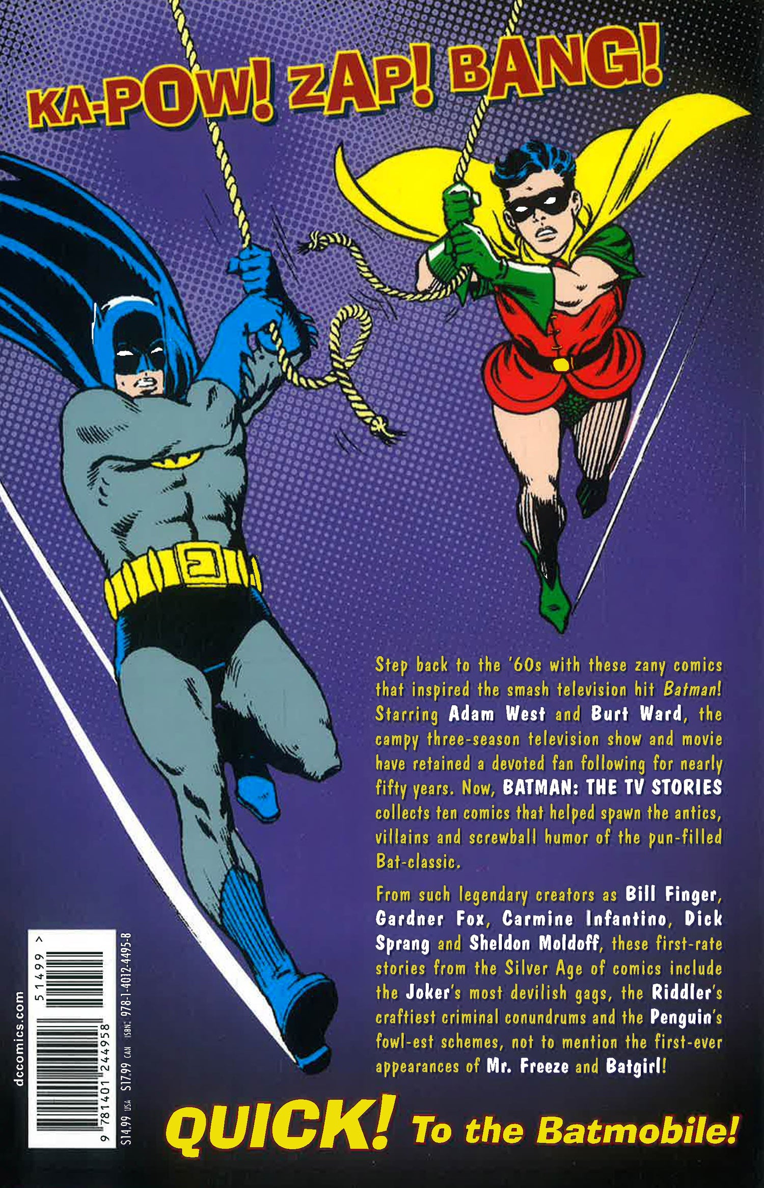 For the first time, DC Comics collects Batman stories originally published between 1948 and 1966 that were adapted into specific episodes of the classic Batman TV series! Starring The Joker, The Penguin, The Riddler and Mr. Freeze (here called “Mr. Zero”), and featuring the debut of Batgirl, these stories have never been collected together before. Collected from BATMAN #53, 73, 121, 140, 169 and 171, and DETECTIVE COMICS #230, 346 and 359.