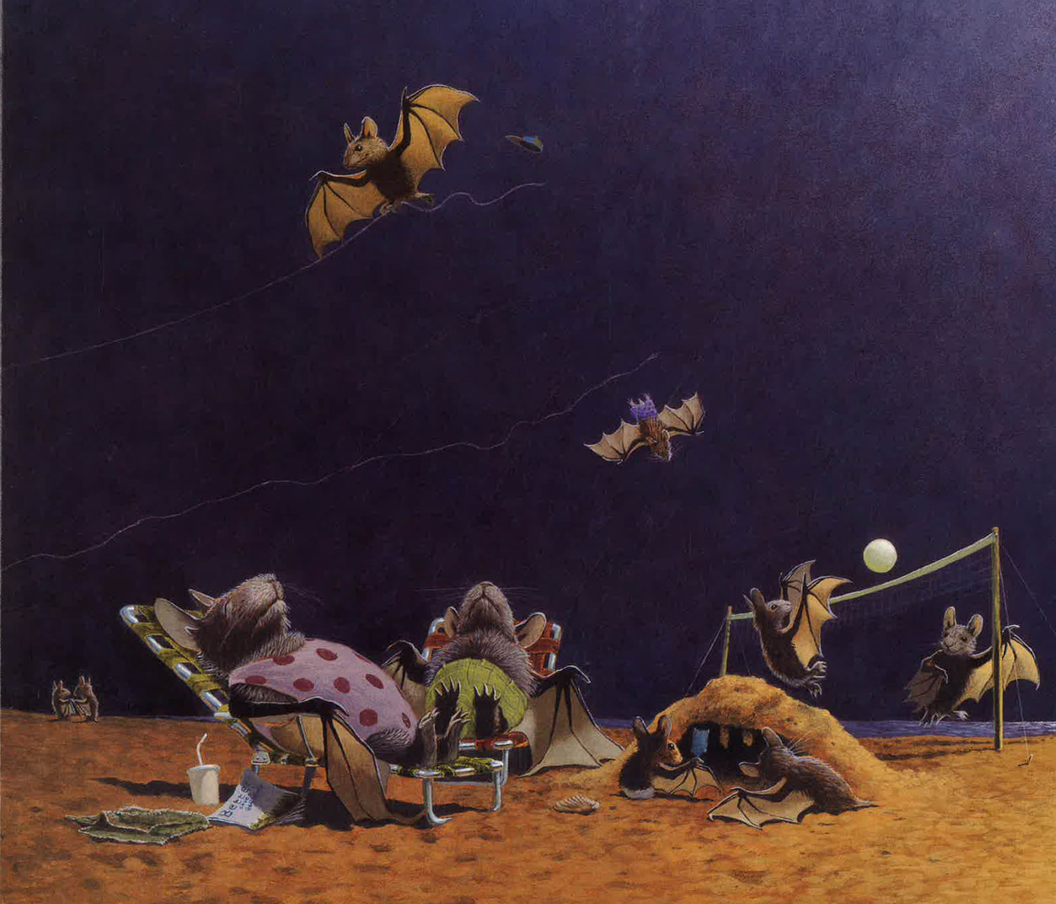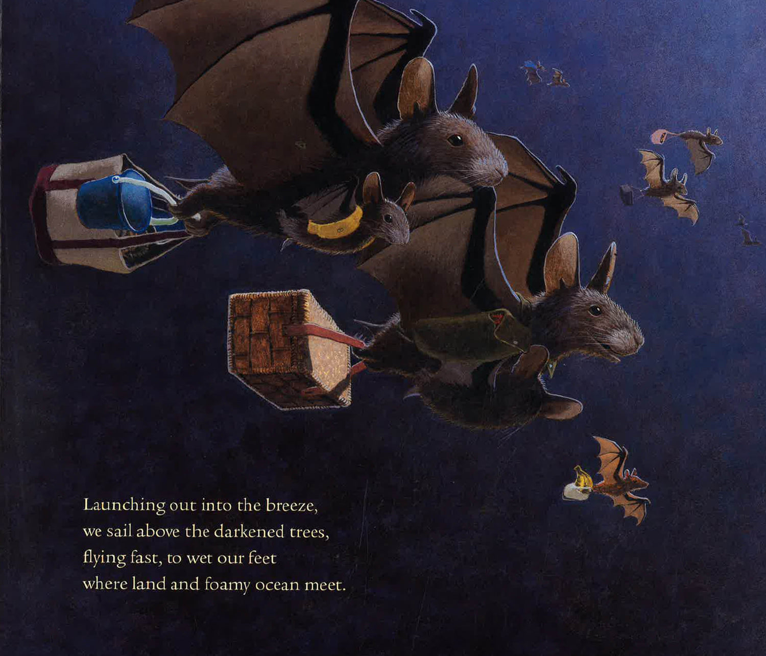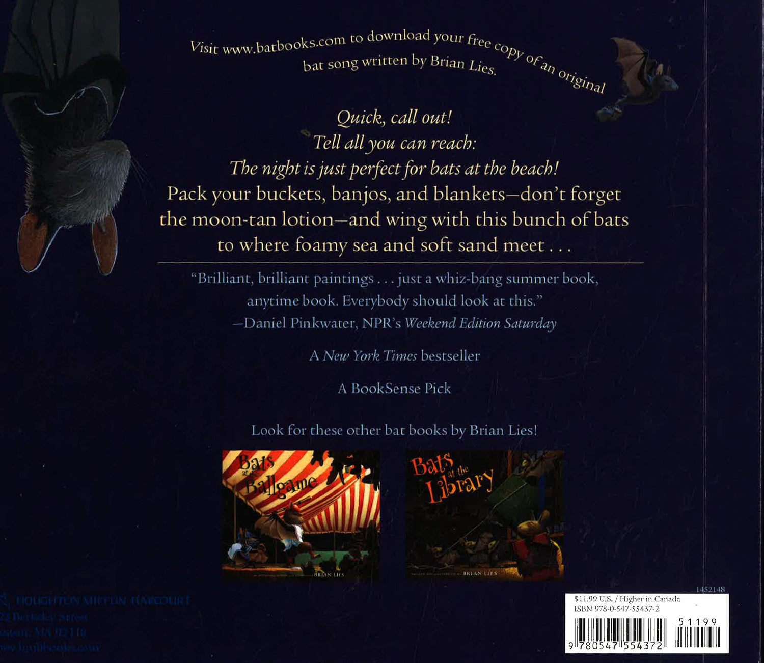 The sun goes down and bats come out to play. It's a perfect night to go to the beach! So pack your buckets, banjos, and blankets - don't forget the moon-tan lotion - and wing with this bunch of bats to where foamy sea and soft sand meet. This new lap board book edition includes lyrics to an original bat song by Brian Lies! You can also download the song for your listening pleasure.