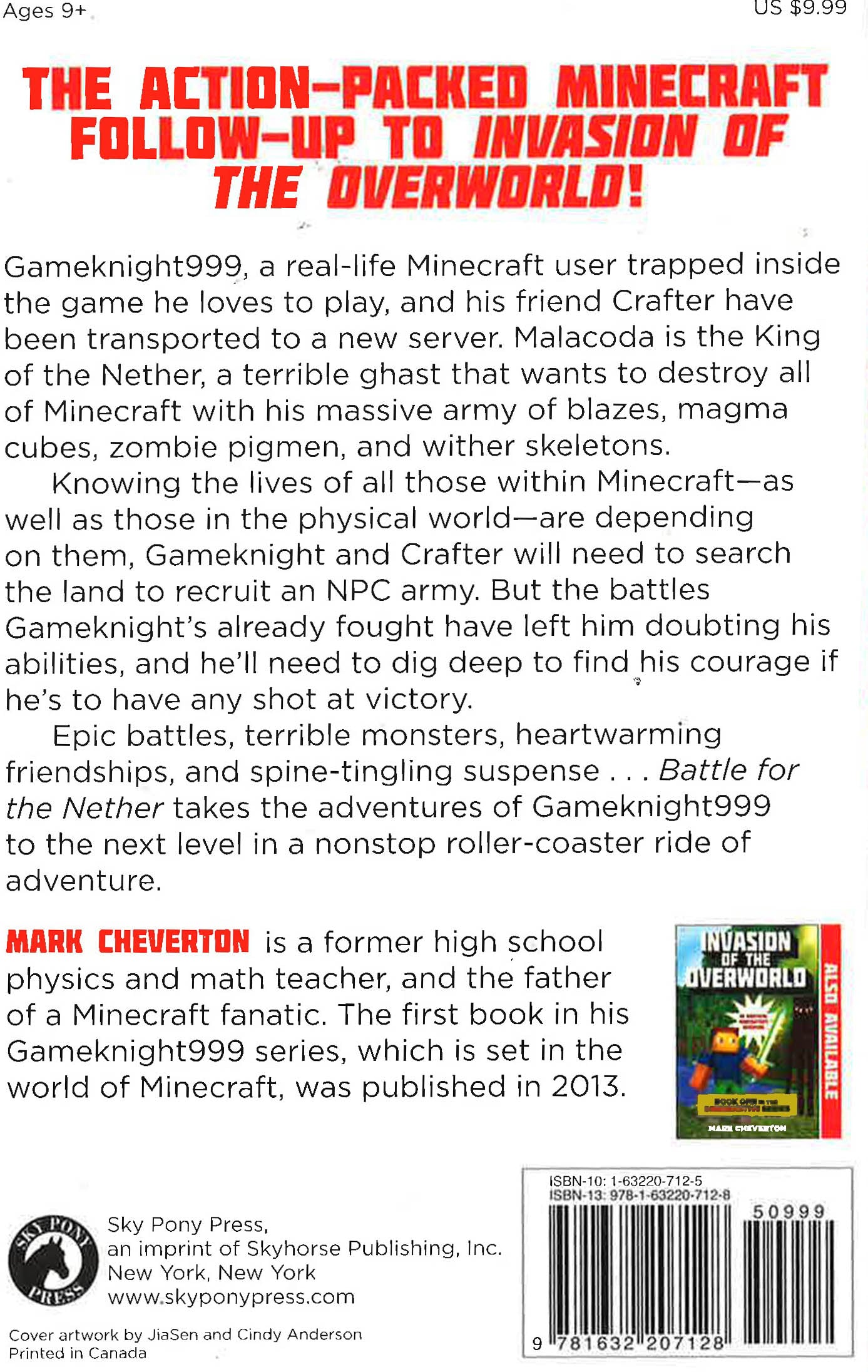 Gameknight999, a real-life Minecraft user trapped inside the game he loves to play, and his friend Crafter have transported to a new server. Malacoda is the King of the Nether, a terrible ghast that wants to destroy all of Minecraft with his massive army of blazes, magma cubes, zombie pigmen, and wither skeletons. Knowing the lives of all those within Minecraft - as well as those in the physical world - are depending on them, Gameknight and Crafter will need to search the land to recruit an NPC army. But the battles Gameknight's already fought have left him doubting his abilities, and he'll need to dig deep to find his courage if he's to have any shot at victory. Epic battles, terrible monsters, heartwarming friendships, and spine-tingling suspense... Battle for the Nether takes the adventures of Gameknight999 to the next level in a nonstop roller-coaster ride of adventure.