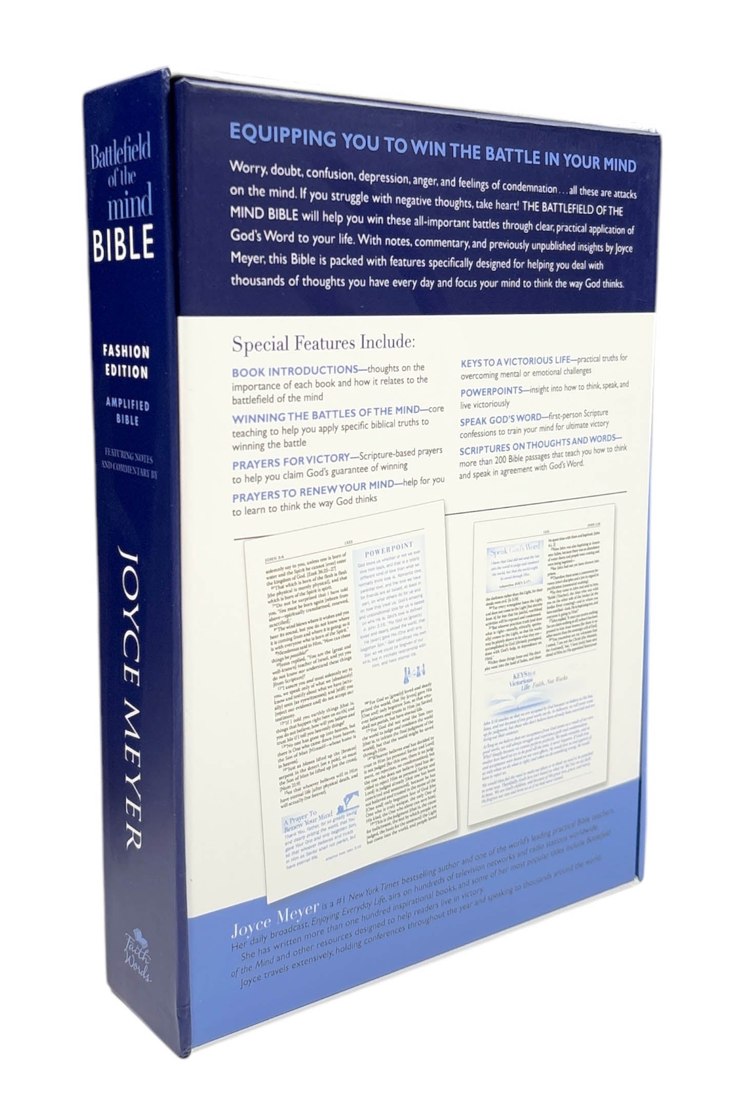 Worry, doubt, confusion, depression, anger, and feelings of condemnation. . .all these are attacks on the mind. If you struggle with negative thoughts, take heart! The Battlefield of the Mind Bible will help you win these all-important battles through clear, practical application of God's Word to your life. With notes, commentary, and previously unpublished insights by Joyce Meyer, this Bible is packed with features specifically designed for helping you deal with thousands of thoughts you have every day and focus your mind to think the way God thinks.