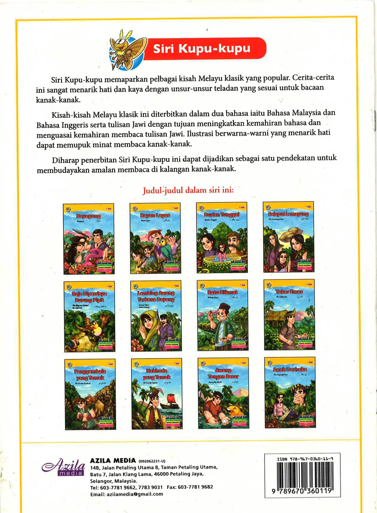Kisah-kisah Melayu klasik ini diterbitkan dalam dua bahasa iaitu Bahasa Malaysia dan Bahasa Inggeris serta tulisan Jawi dengan tujuan meningkatkan kemahiran bahasa dan menguasai kemahiran membaca tulisan Jawi. Ilustrasi berwarna-warni yang menarik hati dapat memupuk minat membaca kanak-kanak.