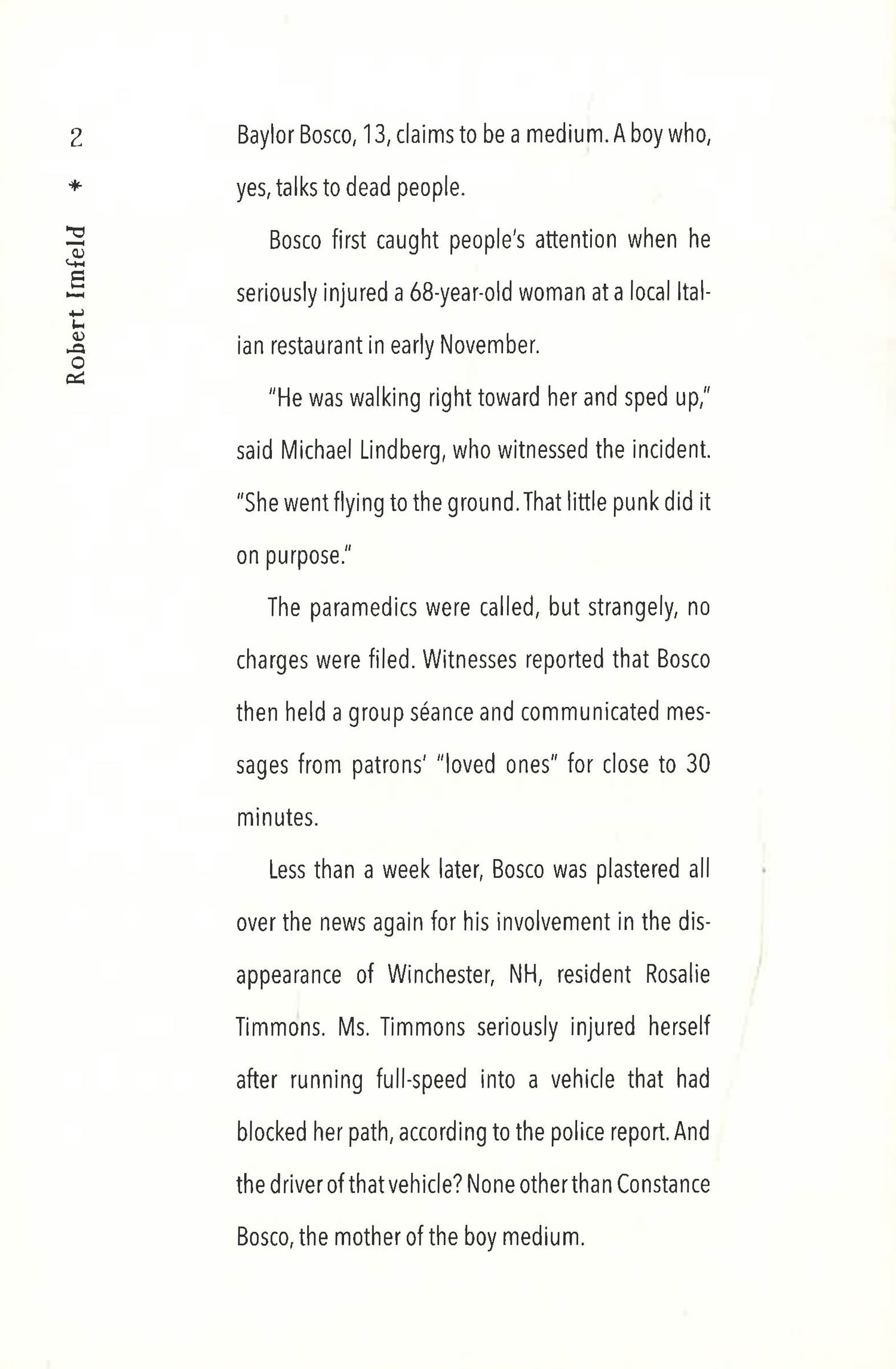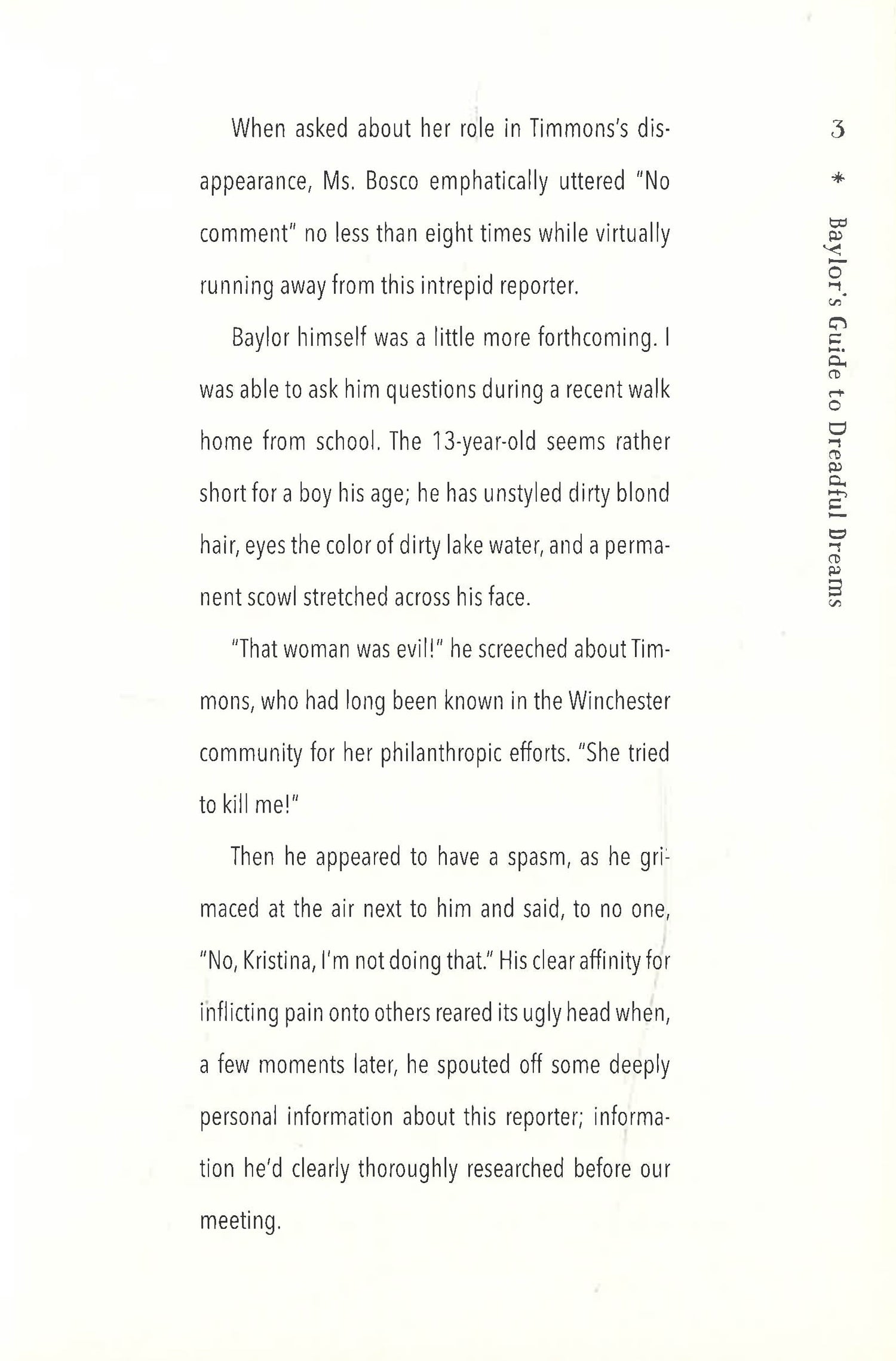 Boy medium Baylor Bosco enters the dream world with his ghostly twin Kristina to discover what has happened to a bunch of missing kids in this second spooky novel in a new series that James Patterson called "a fun ride with chills galore." With assistance from a powerful amulet, Baylor Bosco, boy medium extraordinaire, finds himself with a dazzling new ability: he can walk through dreams. Not only his own, but those of other people! Using a starry, otherworldly portal called Loved One's Lane, Baylor tumbles through the dreams of his friends, family--even his cranky aunt. But with Baylor, nothing's ever as easy as it seems! Soon Baylor is dream-walking through a terrifying reality: two teenagers, Archie and Helena, who are stranded at sea. The kids have been missing for over a week and Baylor is the only person who can reach them. The only problem is, Baylor has no way of telling where Archie and Helena are outside of his dream world. And time is running out. Not to mention that a group of wandering demon spirits, The Lost Souls, are after Baylor, too. Can Baylor find the missing kids--and escape the clutches of the Lost Souls--before it's too late?