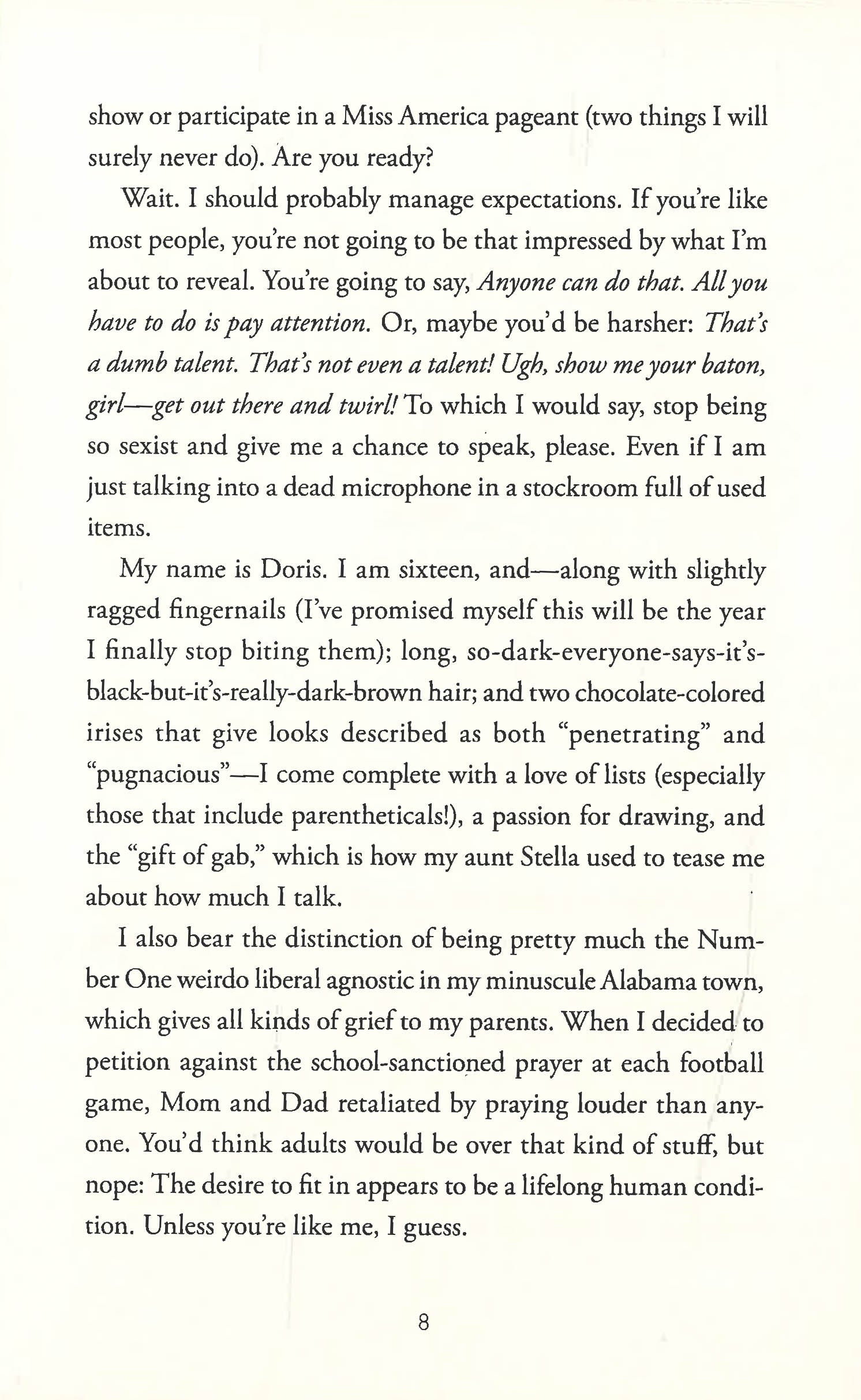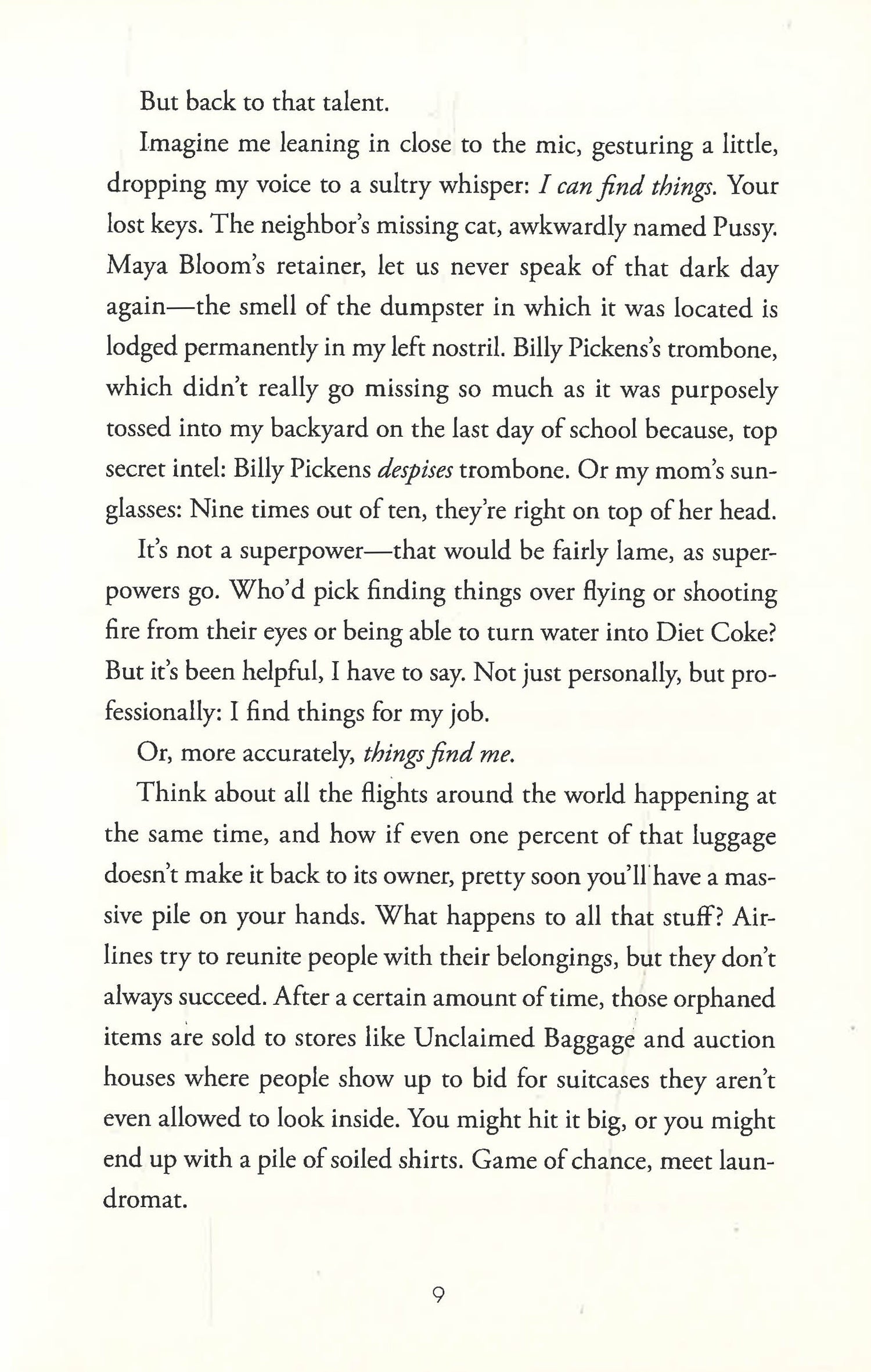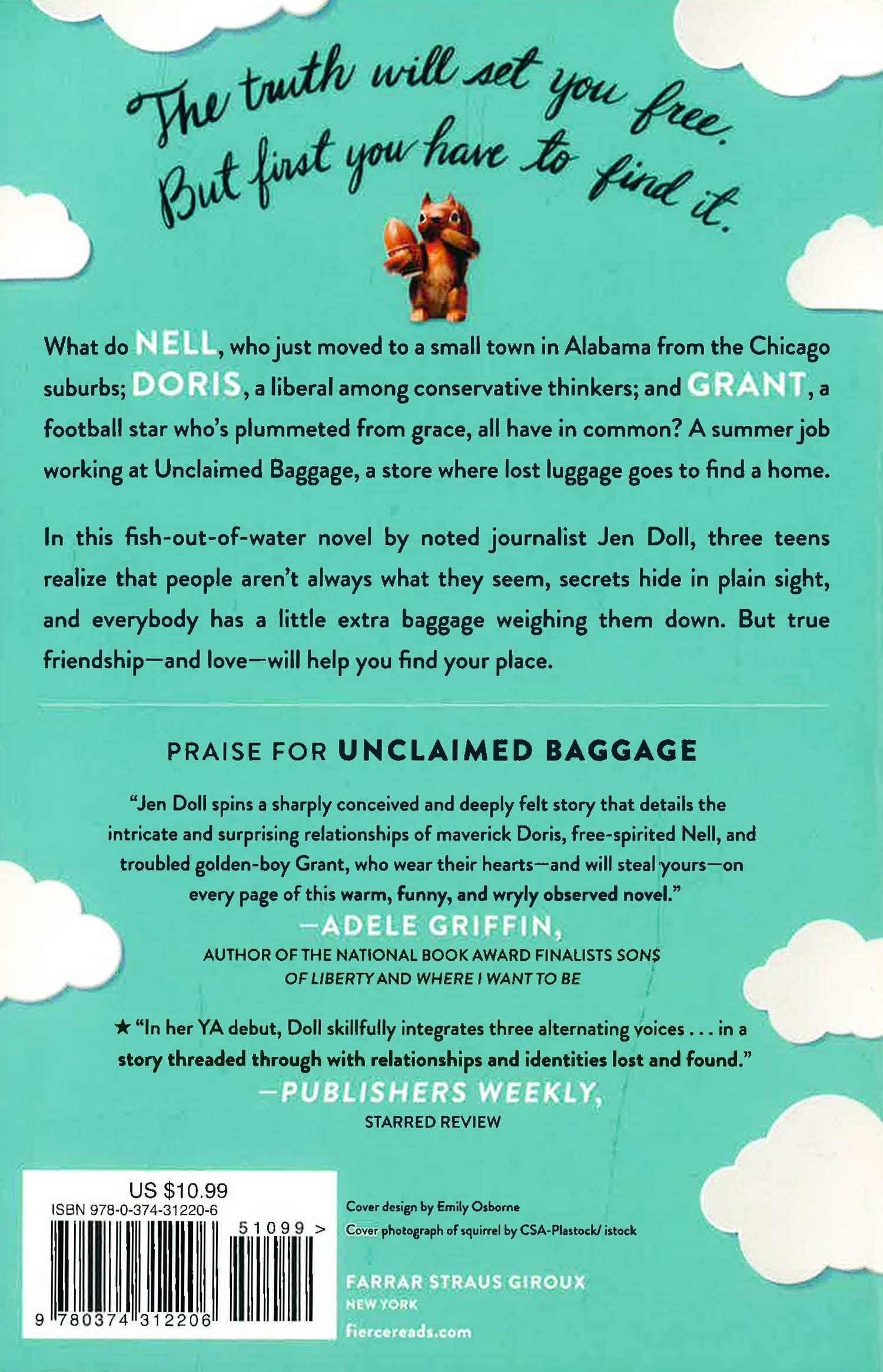 Doris—a lone liberal in a conservative small town—has mostly kept to herself since the terrible waterslide incident a few years ago. Nell had to leave behind her best friends, perfect life, and too-good-to-be-true boyfriend in Chicago to move to Alabama. Grant was the star quarterback and epitome of "Mr. Popular" whose drinking problem has all but destroyed his life. What do these three have in common? A summer job working in a store called Unclaimed Baggage cataloging and selling other people's lost luggage. Together they find that through friendship, they can unpack some of their own emotional baggage and move on into the future.