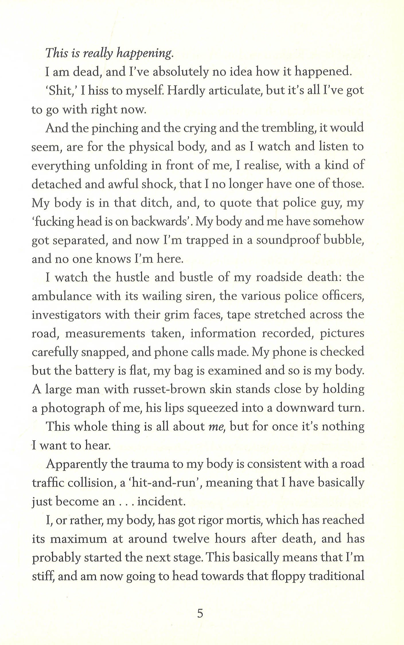 Lily has died in a car accident. The trouble is, Lily's really not at all sure she wants to 'move on' . . . This funny, heartbreaking novel is perfect if you loved John Green or The Lovely Bones.Lily wakes up one crisp Sunday morning on the side of the road.She has no idea how she got there. It is all very peaceful. And very beautiful. It is only when the police car, and then the ambulance, arrive and she sees her own body that she realises that she is in fact . . . dead.But what is she supposed do now?Lily has no option but to follow her body and she sees her family - her parents and her twin brother - start falling apart. And then her twin brother Ben gives her a once in a deathtime opportunity - to use his own body for a while. But will Lily give Ben his body back? She is beginning to have a rather good time . . .A moving, startlingly funny and yet achingly sad debut novel from a stunning new talent.WINNER of the RED award (Read Enjoy Debate) 2019
