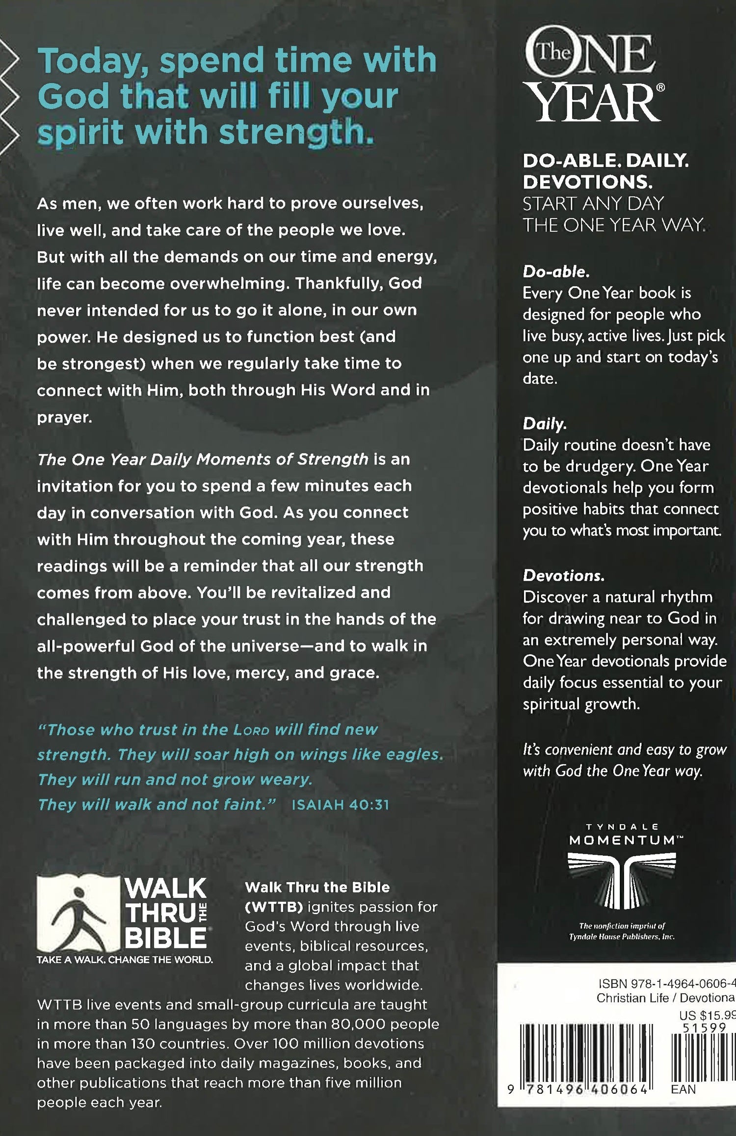 Today, spend time with God that will fill your spirit with strength. The One Year Daily Moments of Strength will help men experience a deeper and more powerful connection with the Lord each day.