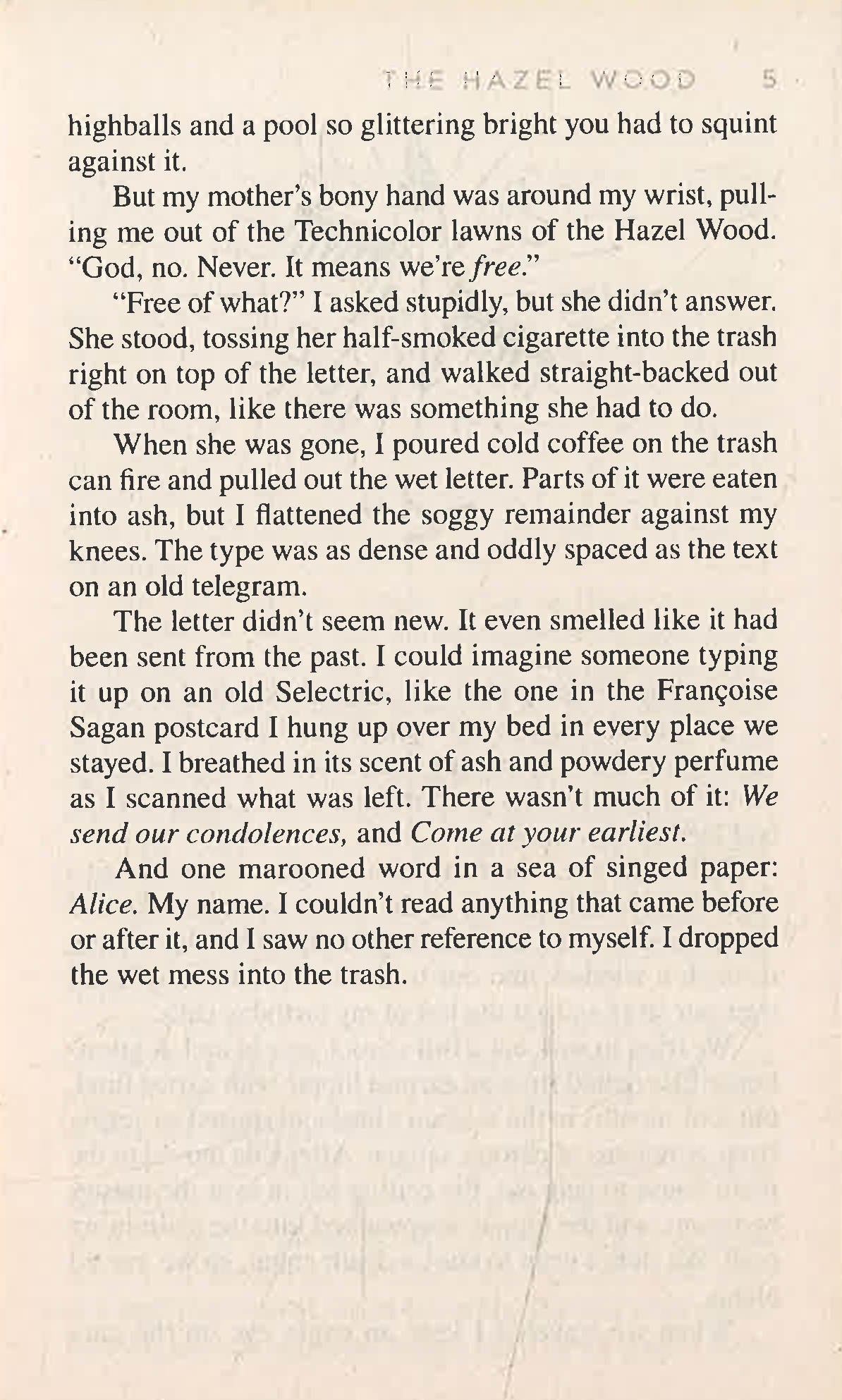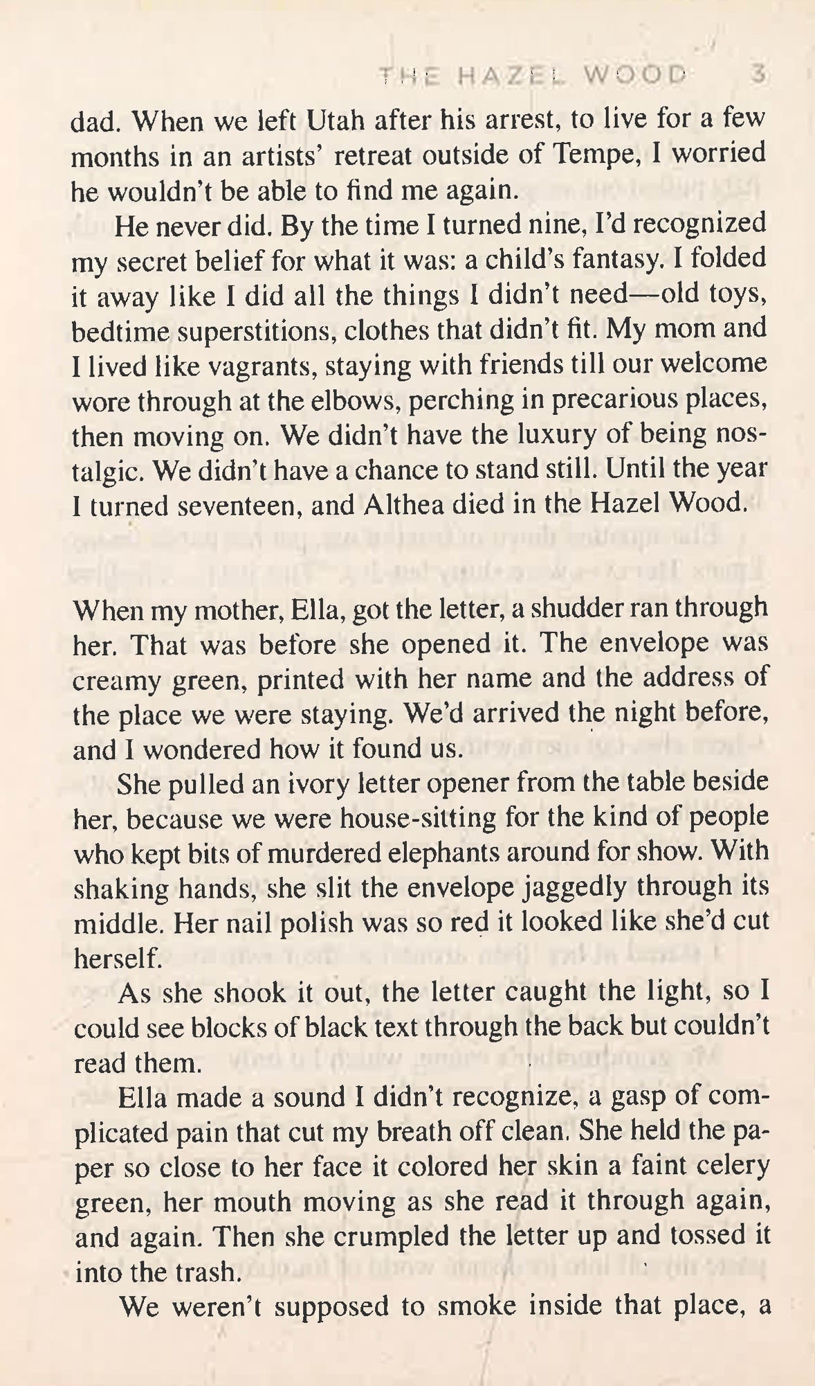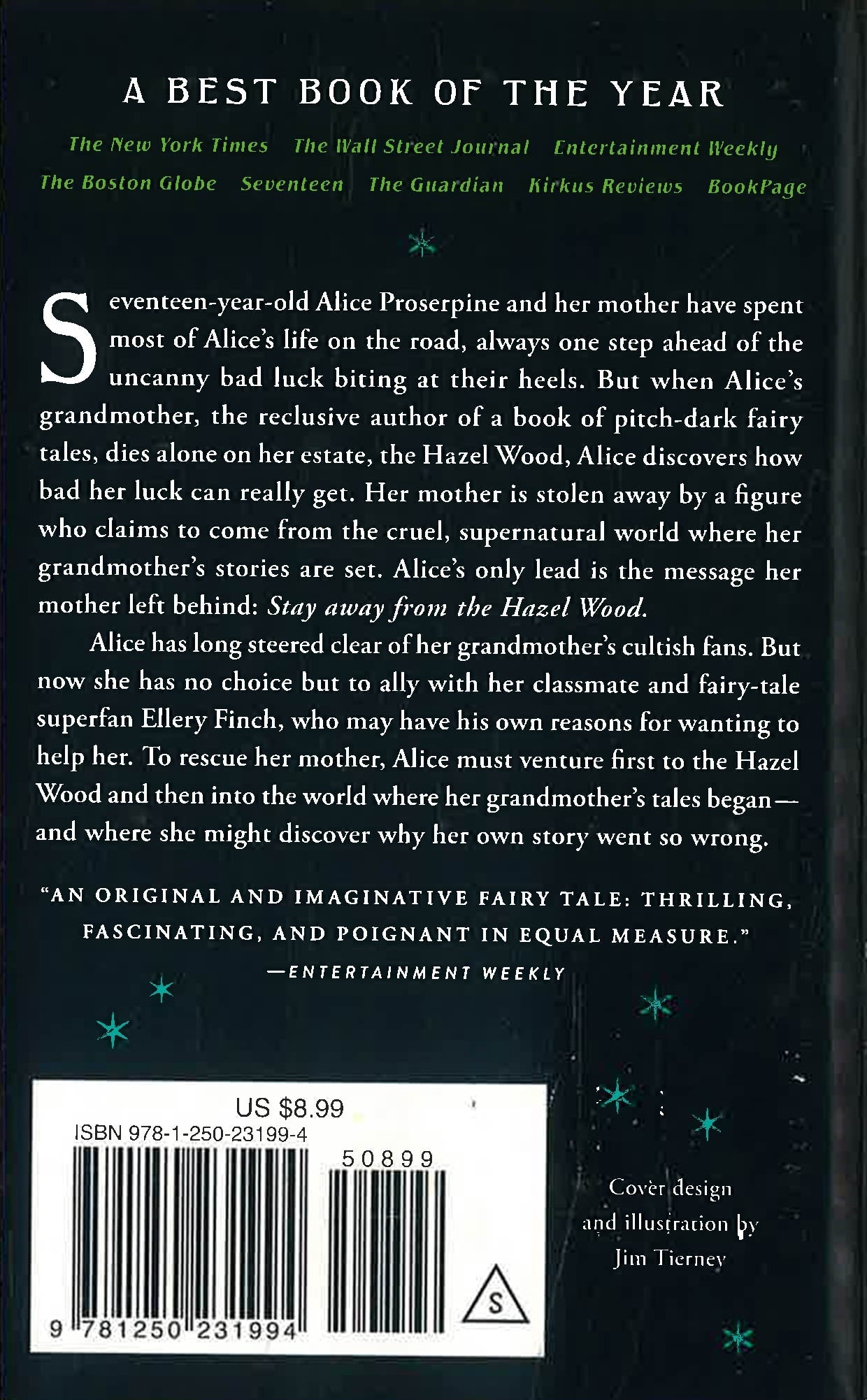 Seventeen-year-old Alice and her mother have spent most of Alice's life on the road, always a step ahead of the uncanny bad luck biting at their heels. But when Alice's grandmother, the reclusive author of a cult-classic book of pitch-dark fairy tales, dies alone on her estate, the Hazel Wood, Alice learns how bad her luck can really get: Her mother is stolen away--by a figure who claims to come from the Hinterland, the cruel supernatural world where her grandmother's stories are set. Alice's only lead is the message her mother left behind: "Stay away from the Hazel Wood."