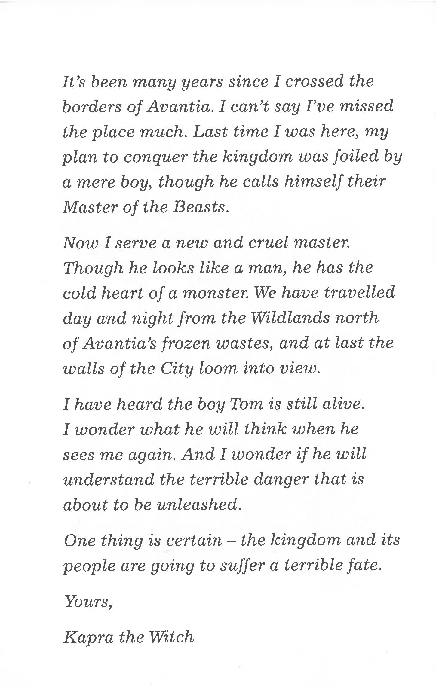 King Hugo's brother Prince Angelo, long believed dead, has reappeared and seized power. Banished from their kingdom, Tom and Elenna must uncover the truth about Prince Angelo ... but there are new and deadly Beasts on the loose. How can they defeat Torka the three-headed dragon?