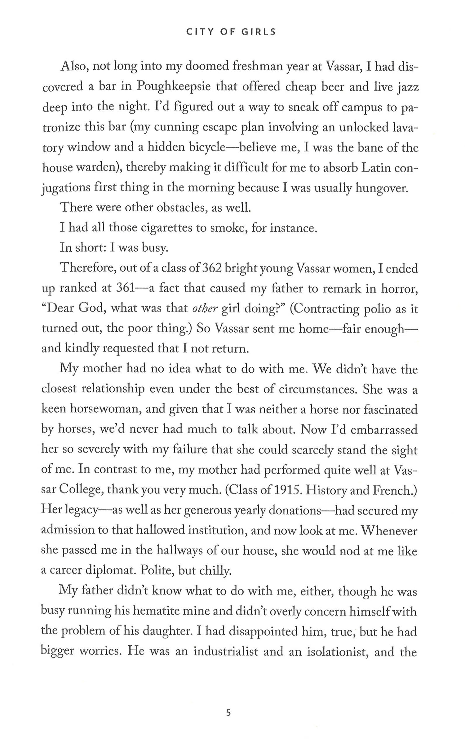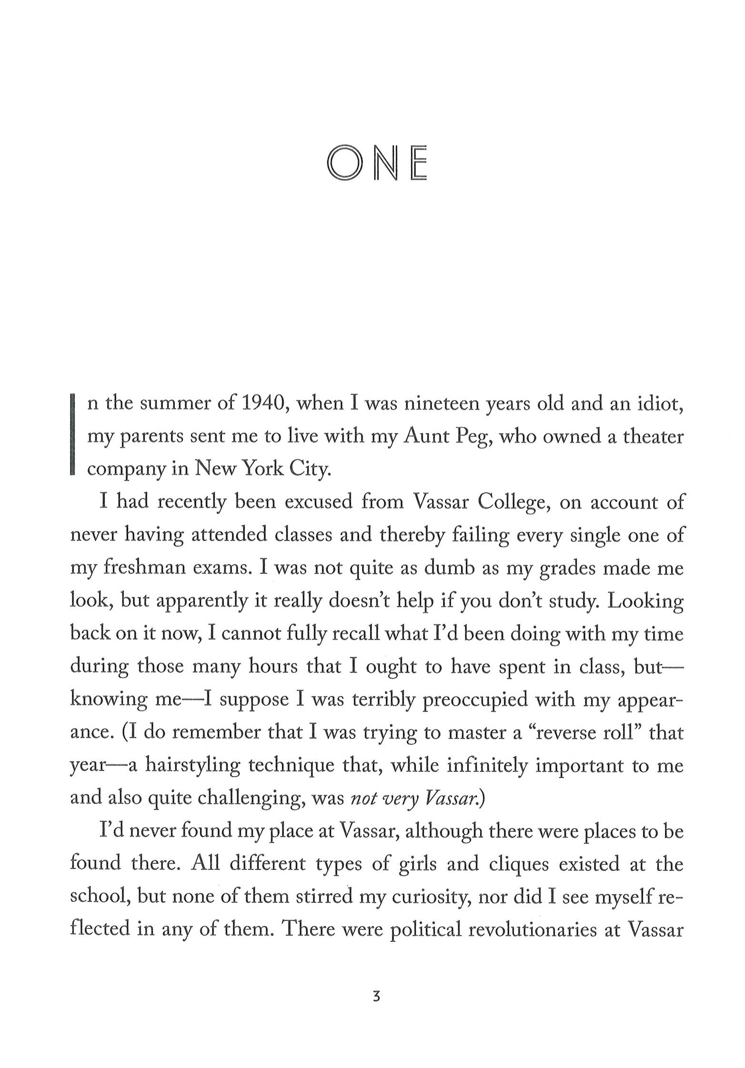 It is the summer of 1940. Nineteen-year-old Vivian Morris arrives in New York with her suitcase and sewing machine, exiled by her despairing parents. Although her quicksilver talents with a needle and commitment to mastering the perfect hair roll have been deemed insufficient for her to pass into her sophomore year of Vassar, she soon finds gainful employment as the self-appointed seamstress at the Lily Playhouse, her unconventional Aunt Peg's charmingly disreputable Manhattan revue theatre. There, Vivian quickly becomes the toast of the showgirls, transforming the trash and tinsel only fit for the cheap seats into creations for goddesses.