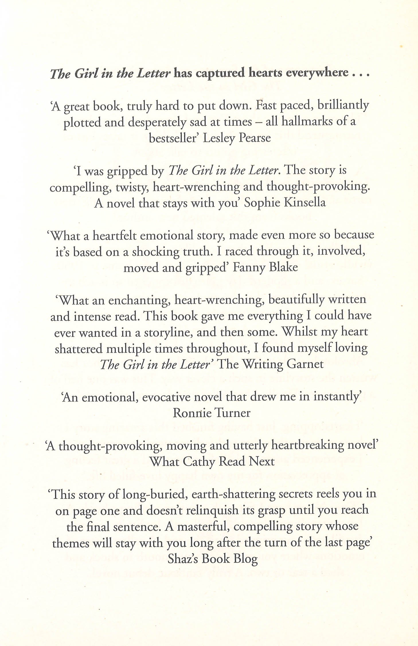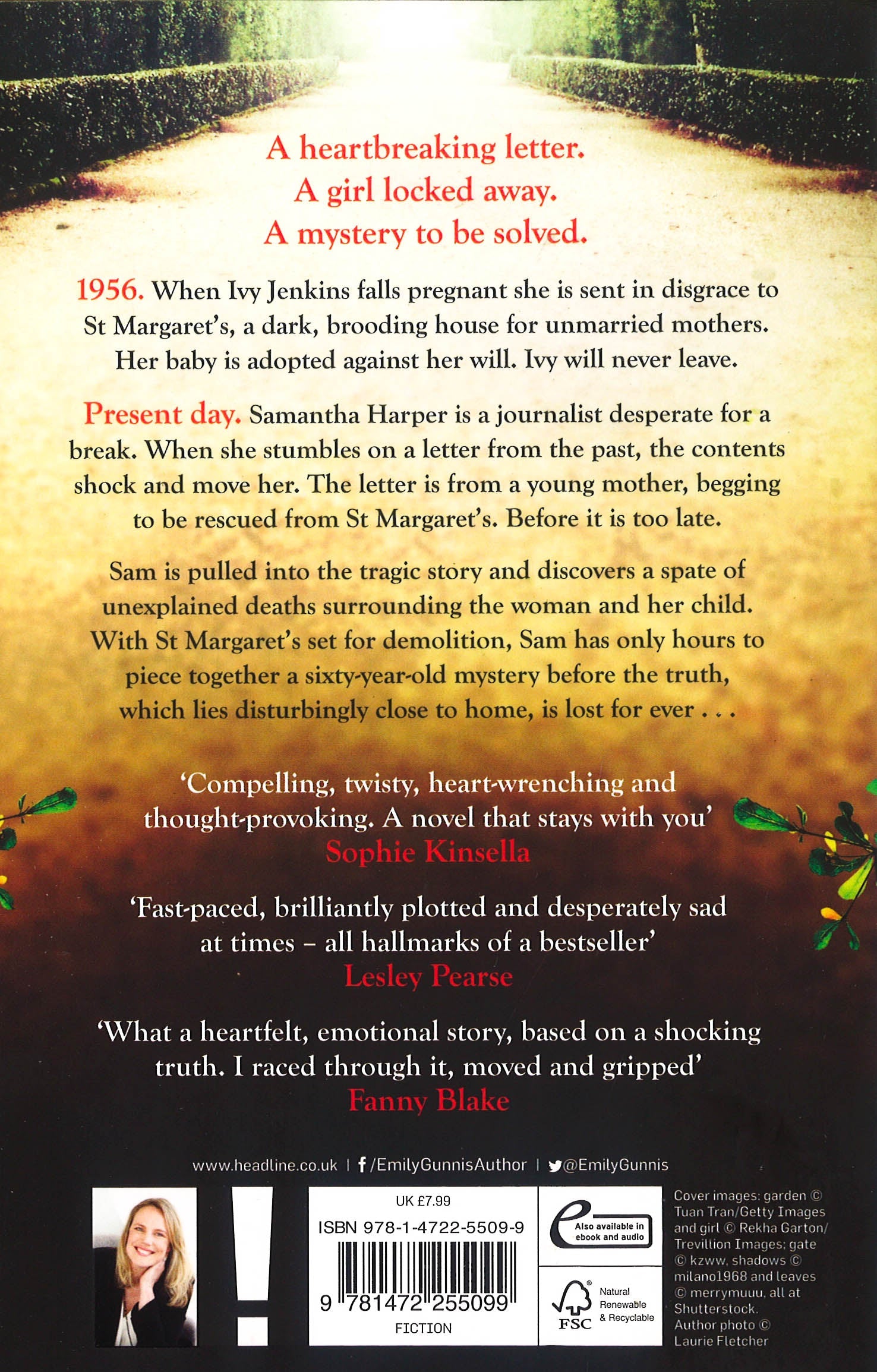 Read her letter. Remember her story...Gripping. Mesmerising. Haunting. Heart-breaking. Once you've heard her story, you will never forget The Girl in the Letter.Perfect for fans of Kate Morton, Rachel Hore and Kathryn Hughes, this page-turning, moving novel of separation and long-buried secrets will stay with you for ever.In the winter of 1956 pregnant young Ivy is sent in disgrace to St Margaret's, a home for unmarried mothers in the south of England, run by nuns, to have her child. Her baby daughter is adopted. Ivy will never leave. Sixty years later, journalist Samantha stumbles upon a series of letters from Ivy to her lover, pleading with him to rescue her from St Margaret's before it is too late. As Sam pieces together Ivy's tragic story, terrible secrets about St Margaret's dark past begin to emerge. What happened to Ivy, to her baby, and to the hundreds of children born in the home? What links a number of mysterious, sudden deaths in the area? And why are those who once worked at St Margaret's so keen that the truth should never be told? As Sam unpicks the sinister web of lies surrounding St Margaret's, she also looks deep within - to confront some unwelcome truths of her own...