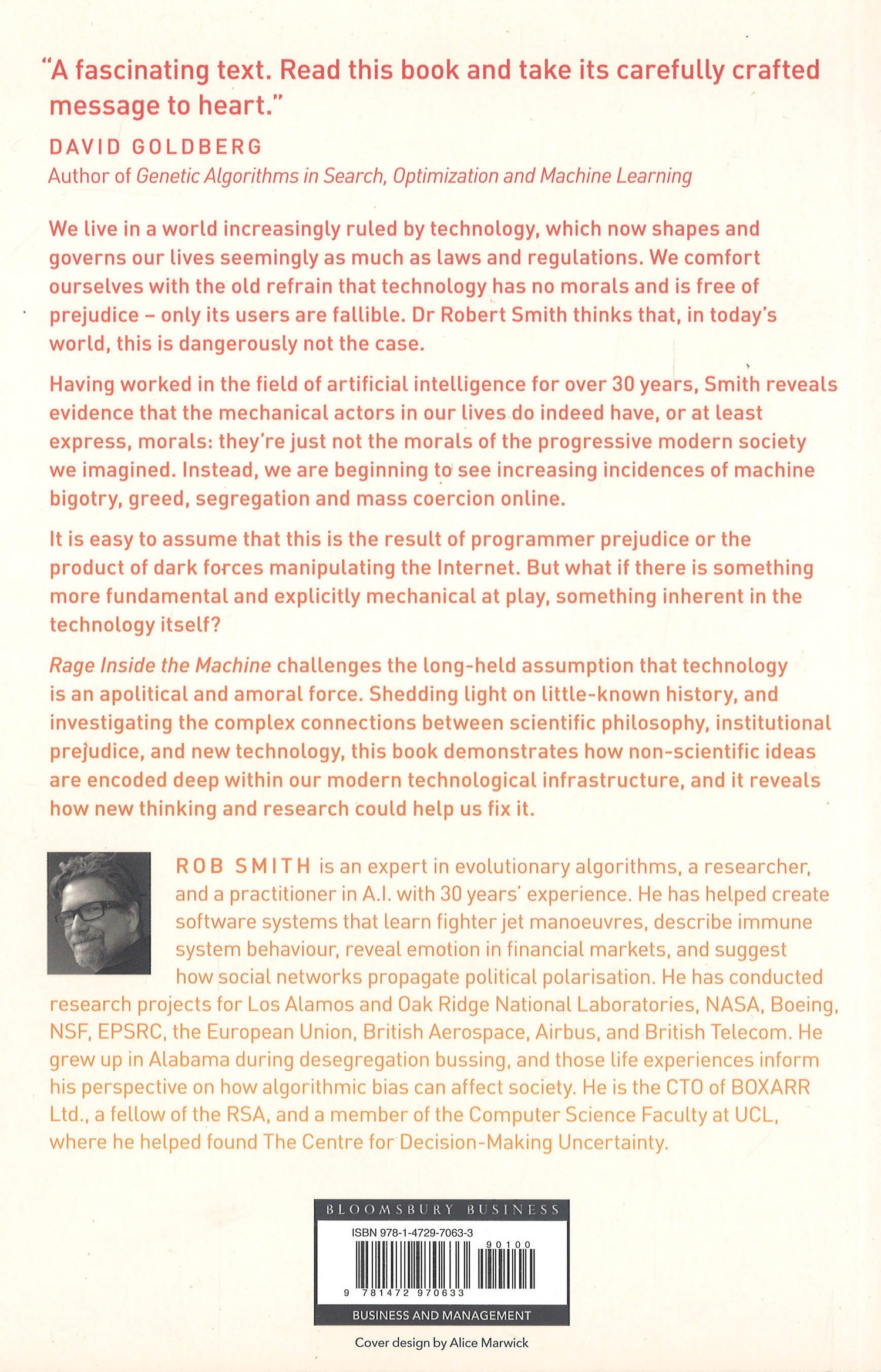 Shortlisted for the 2020 Business Book Awards We live in a world increasingly ruled by technology; we seem as governed by technology as we do by laws and regulations. Frighteningly often, the influence of technology in and on our lives goes completely unchallenged by citizens and governments. We comfort ourselves with the soothing refrain that technology has no morals and can display no prejudice, and it's only the users of technology who distort certain aspects of it. But is this statement actually true? Dr Robert Smith thinks it is dangerously untrue in the modern era. Having worked in the field of artificial intelligence for over 30 years, Smith reveals the mounting evidence that the mechanical actors in our lives do indeed have, or at least express, morals: they're just not the morals of the progressive modern society that we imagined we were moving towards. Instead, as we are just beginning to see - in the US elections and Brexit to name but a few - there are increasing incidences of machine bigotry, greed and the crass manipulation of our basest instincts. It is easy to assume that these are the result of programmer prejudices or the product of dark forces manipulating the masses through the network of the Internet. But what if there is something more fundamental and explicitly mechanical at play, something inherent within technology itself? This book demonstrates how non-scientific ideas have been encoded deep into our technological infrastructure. Offering a rigorous, fresh perspective on how technology has brought us to this place, Rage Inside the Machine challenges the long-held assumption that technology is an apolitical and amoral force. Shedding light on little-known historical stories and investigating the complex connections between scientific philosophy, institutional prejudice and new technology, this book offers a new, honest and more truly scientific vision of ourselves.